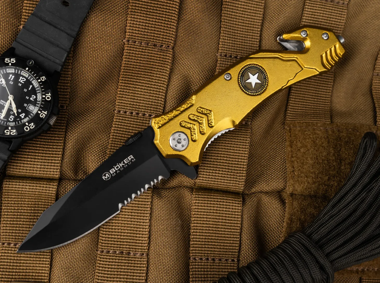 Hinweis: Seit dem 31.10.2024 gilt in Deutschland ein generelles Umgangs- und Besitzverbot von Springmessern aller Art. Es handelt sich ab sofort um verbotene Gegenstände, deren Besitz strafbar ist. Der Besitz von bestimmten Springmessern ist gem. Anlage 2 zum Waffengesetz Abschnitt 1 Nummer 1.4.1 nur noch Personen erlaubt, bei denen ein berechtigtes Interesse besteht, das eine einhändige Nutzung erforderlich macht (etwa aufgrund eines fehlenden Arms oder einer fehlenden bzw. dysfunktionalen Hand), oder der Umgang im Zusammenhang mit der Berufsausübung (z.B. Jagd, Handwerk) oder dem Sport (z.B. Segeln oder Bergsteigen) erfolgt. Gleiches gilt für gewerbliche Händler oder Hersteller solcher Messer. Die Abgabe erfolgt daher nur noch an berechtigte Personen. Bitte prüfen Sie vor der Bestellung, ob ein solches berechtigtes Interesse bei Ihnen vorliegt.Das stabile Magnum Army Rescue ist ein zuverlässiges Rettungsmesser, das zahlreiche praktische Funktionen vereint und im Notfall Leben retten kann. Die schwarz beschichtete Reverse Tantoklinge aus 440A ist mit einem Teilwellenschliff ausgestattet und wird federunterstützt per Flipper geöffnet. Ein stabiler Linerlock arretiert die geöffnete Klinge. Der gold anodisierte Griff aus Aluminium liegt stets sicher in der Hand und ist mit einem detaillierten Army-Emblem versehen. Mit Glasbrecher, Gurtschneider und praktischem Clip (Tip-down/r).