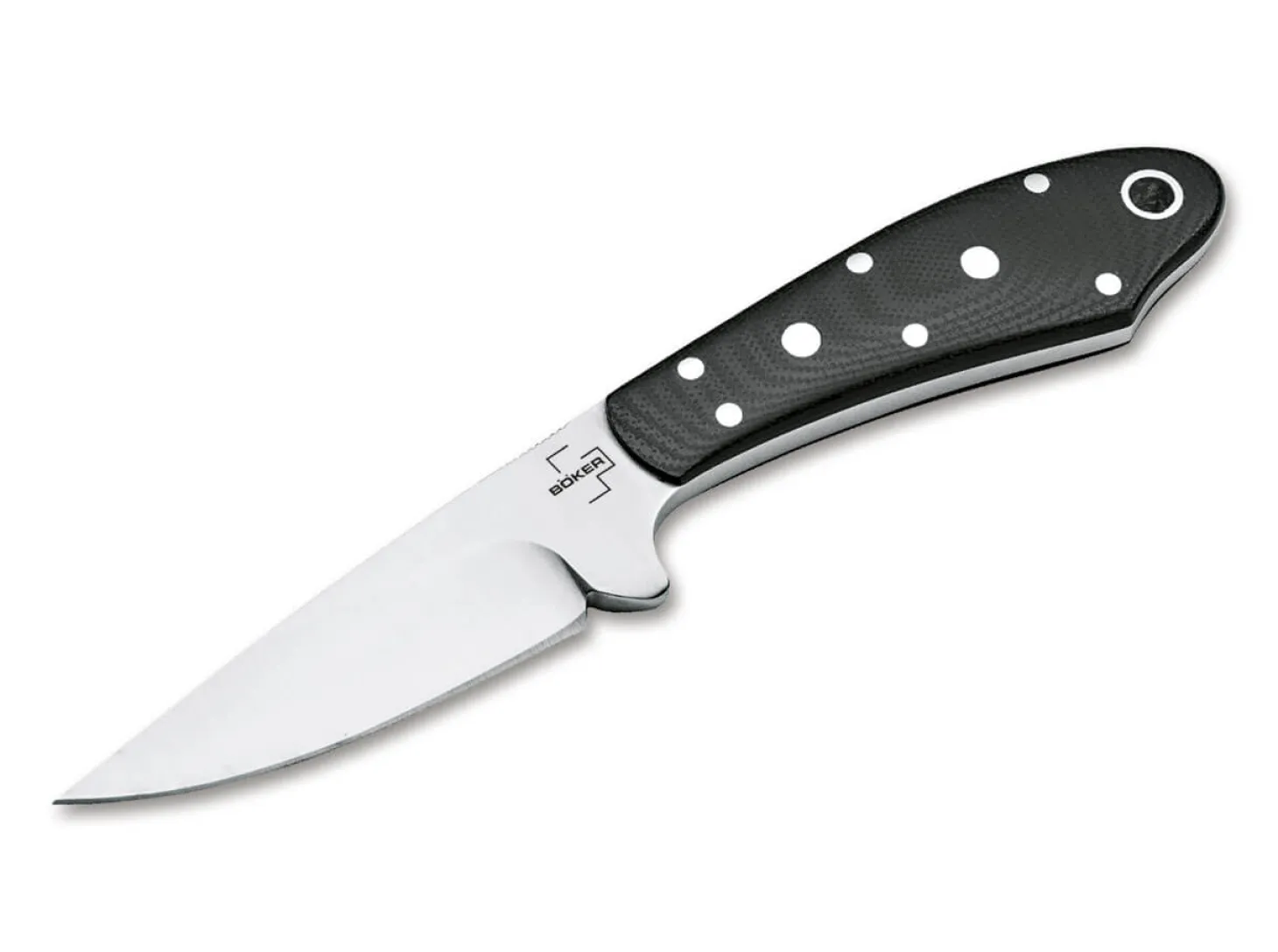 Der für seine ausgefallenen und innovativen Entwürfe bekannte Custom-Messermacher Mickey Yurco besitzt ein unvergleichliches Gespür für Ergonomie und außergewöhnliche Lösungen. Das Böker Plus Backdrop bildet da keine Ausnahme und überzeugt mit einem auf Geschwindigkeit und Flexibilität ausgelegten Konzept. Die passgenaue Kydexscheide kann mit dem beidseitigen Haken in der vorderen Hosentasche, mit der Lederplatte in der Gesäßtasche oder mit der Kugelkette als Neck Knife um den Hals getragen werden.Haken und Platte verhindern, dass die Scheide beim Ziehen des Messers ebenfalls aus der Tasche rutscht und gewährleisten so, dass das Messer stets einsatzbereit ist. Zudem lässt sich das frei mitführbare Backdrop dadurch genauso komfortabel und diskret tragen wie ein Klappmesser. Das handliche Backup-Messer ist mit einer satinierten Klinge aus D2 und Griffschalen aus schwarzem G10 ausgestattet, die mit dekorativen Nieten versehen sind. Die ergonomische Fingermulde und Riffelungen im Bereich der Daumenauflage erhöhen die Arbeitssicherheit. Mit verstärkter Fangriemenöse.