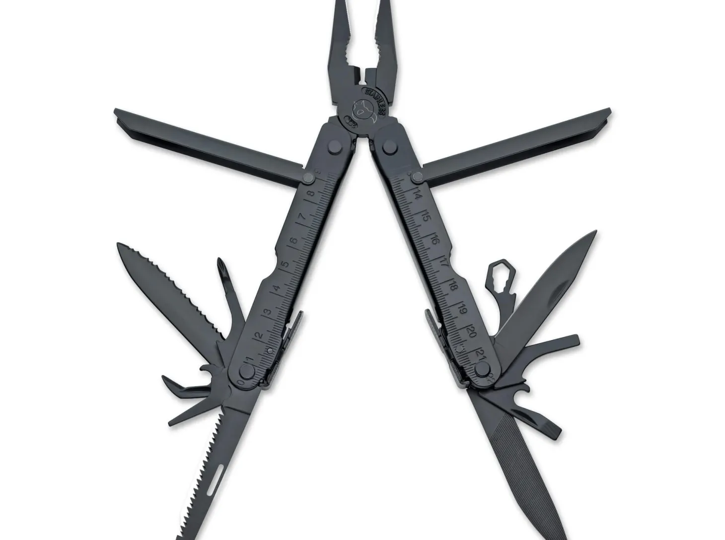 Das klassisch konzipierte Multitool ist mit folgenden Funktionen ausgestattet: Spitzzange mit Drahtschneider, glatte Klinge, Wellenschliffklinge, Phillips-Schraubendreher, 2x Schlitzschraubendreher, Multi-Schraubenschlüssel, Holzsäge, Feile, Flaschenöffner, Dosenöffner und Stechahle. Verriegelnde Klinge und Werkzeuge. Lieferung mit Nylon-Gürteletui.
