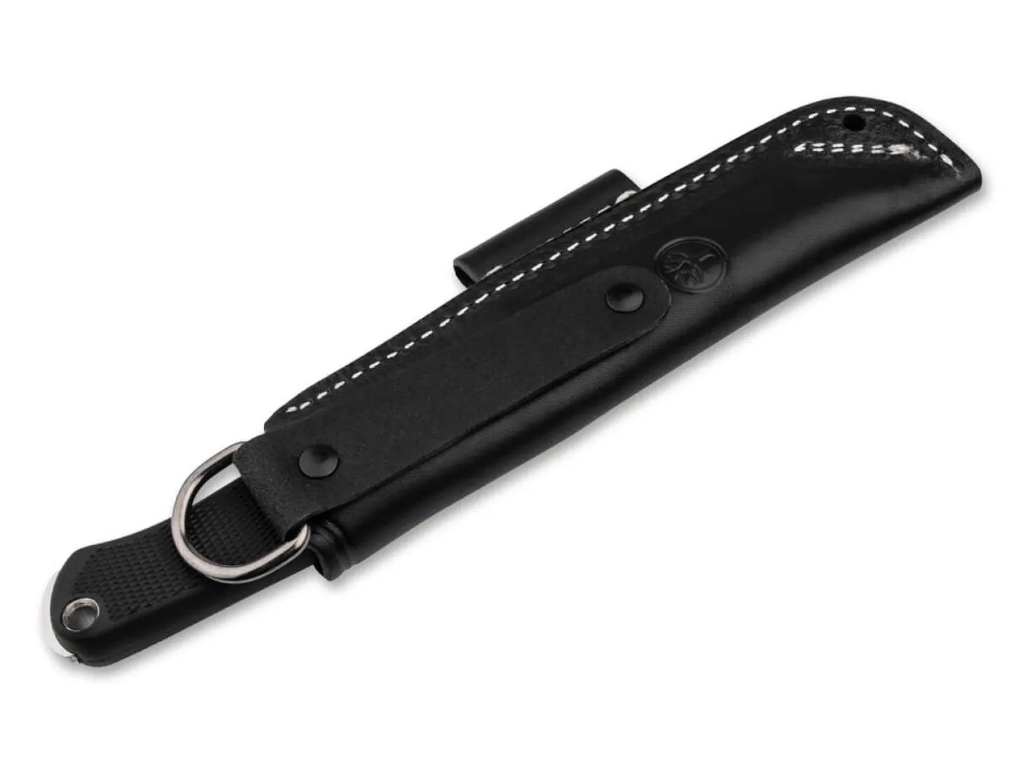 Arbolito BK1 Das Böker Arbolito BK-1 (Bushcraft Knife Nr. 1) stellt ein Heavy Duty Bushcraft-Messer im Stile moderner Piloten-Überlebensmesser par excellence dar. Die breite Droppoint-Klinge hat mit 10,3 cm eine optimale Länge und einen mittelhohen Anschliff für maximale Stabilität. Diese Stabilität wird weiterhin durch die kompromisslose Wahl des Böhler-Stahls N690 gewährleistet. Der Erl ist durchgängig und ragt einige Millimeter aus dem Griffende. Das sorgt für ein Maximum an Stabilität. Als Griffmaterial wurde TPE – thermoplastisches Elastomer – gewählt. Das Material umschließt den Erl vollständig und ist mit einem klassischen Checkering für optimale Griffigkeit versehen. TPE ist widerstandsfähig, elastisch, rutschfest und hat eine geringe Wärmeleitfähigkeit. Das Messer liegt also bei allen Witterungs- und Arbeitsbedingungen sicher in der Hand und zieht bei Nässe und Kälte die Kraft nicht aus den Fingern. Die eingelassene Fangriemenöse ist zusätzlich mit einer Edelstahlhülse gefasst. Zur Ausstattung gehört eine Köcherlederscheide – die Königsdisziplin im Scheidenbau – mit tiefem und festem Sitz des Messers. Das Messer ist beim Führen somit sowohl vor Verlust als auch vor Beschädigung bestmöglich geschützt, ohne eine beschädigungsanfällige Sicherung zu erfordern, die den schnellen Zugriff erschwert. Der genietete Dangler eröffnet zusätzliche Tragemöglichkeiten. Zusätzlich ist die Scheide mit einer breiten, fest in die Keder integrierten, Lederschlaufe ausgestattet, die Platz für die Aufnahme eines Feuerstarters / Metal Match (9,3 mm) bietet (nicht im Lieferumfang enthalten).