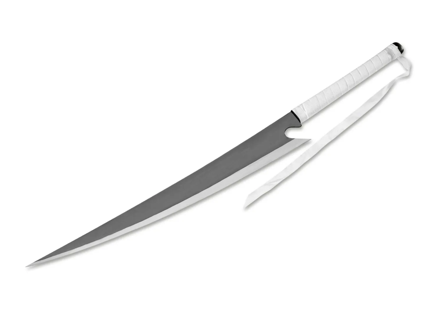 Ein wirklich beeindruckendes Schwert! Durch die mächtige Klinge von 74 cm mit einer maximalen Breite von 9 cm kann man von einem wahrlich imposanten Deko-Schwert sprechen. Die Klinge ist aus Kohlenstoffstahl gefertigt. Die Ausführung des Schwertes entstammt den japanischen Mangas, in denen das Ichigo auch seine Rolle spielt. Das Schwert ist dekorativ abgezogen, was den aufwändigen Charakter unterstreicht. Die Klinge ist geschwärzt und zur Schneide hin poliert. Der Holzgriff ist mit weißem Tuch umwickelt, und entspricht so perfekt seinem Vorbild. Ausgeliefert wird dieses Schwert mit einer auf dem Rücken zu tragenden schwarzen Scheide.Deko- bzw. Sammlerschwert, nicht zum Einsatz geeignet.