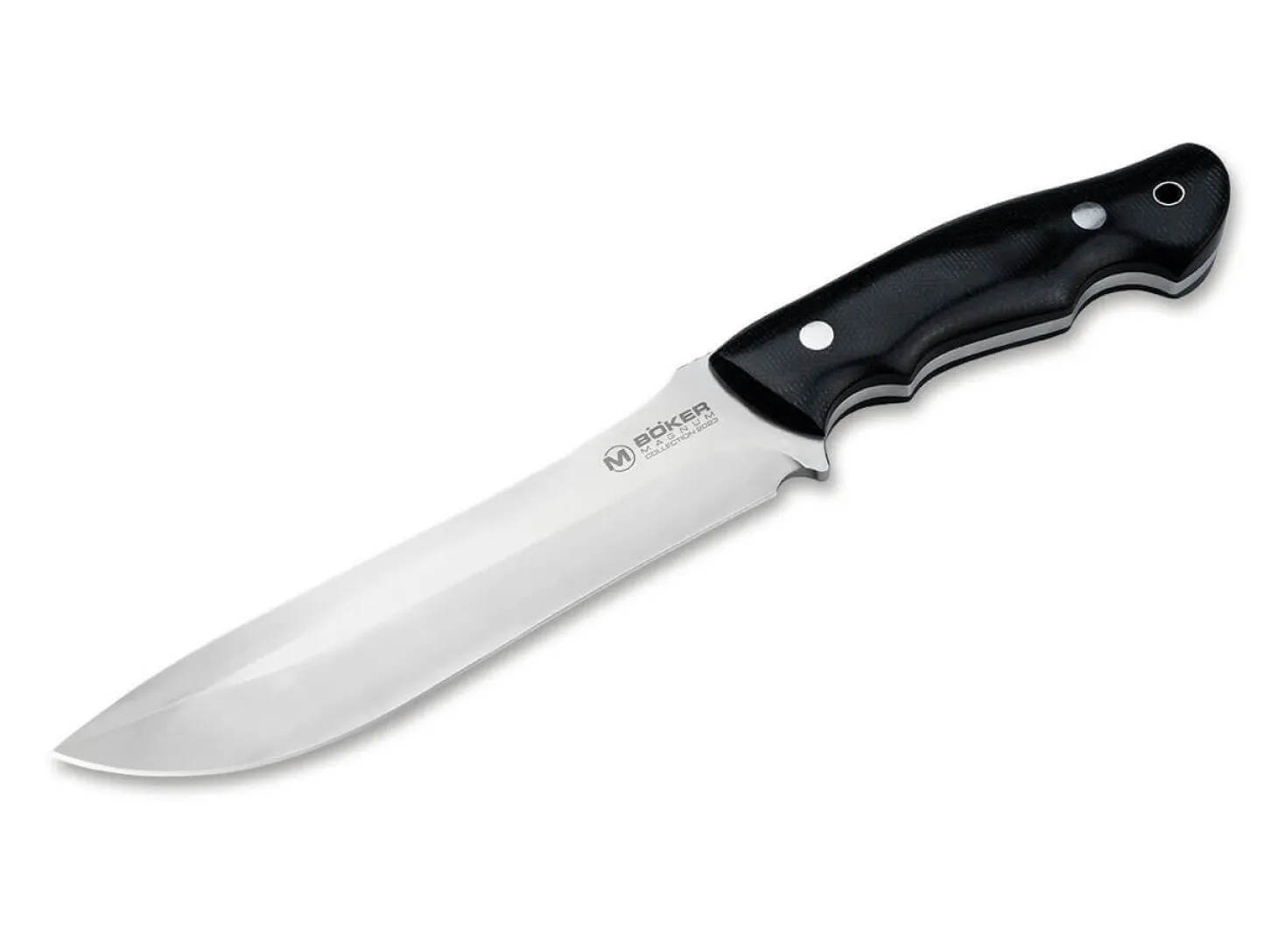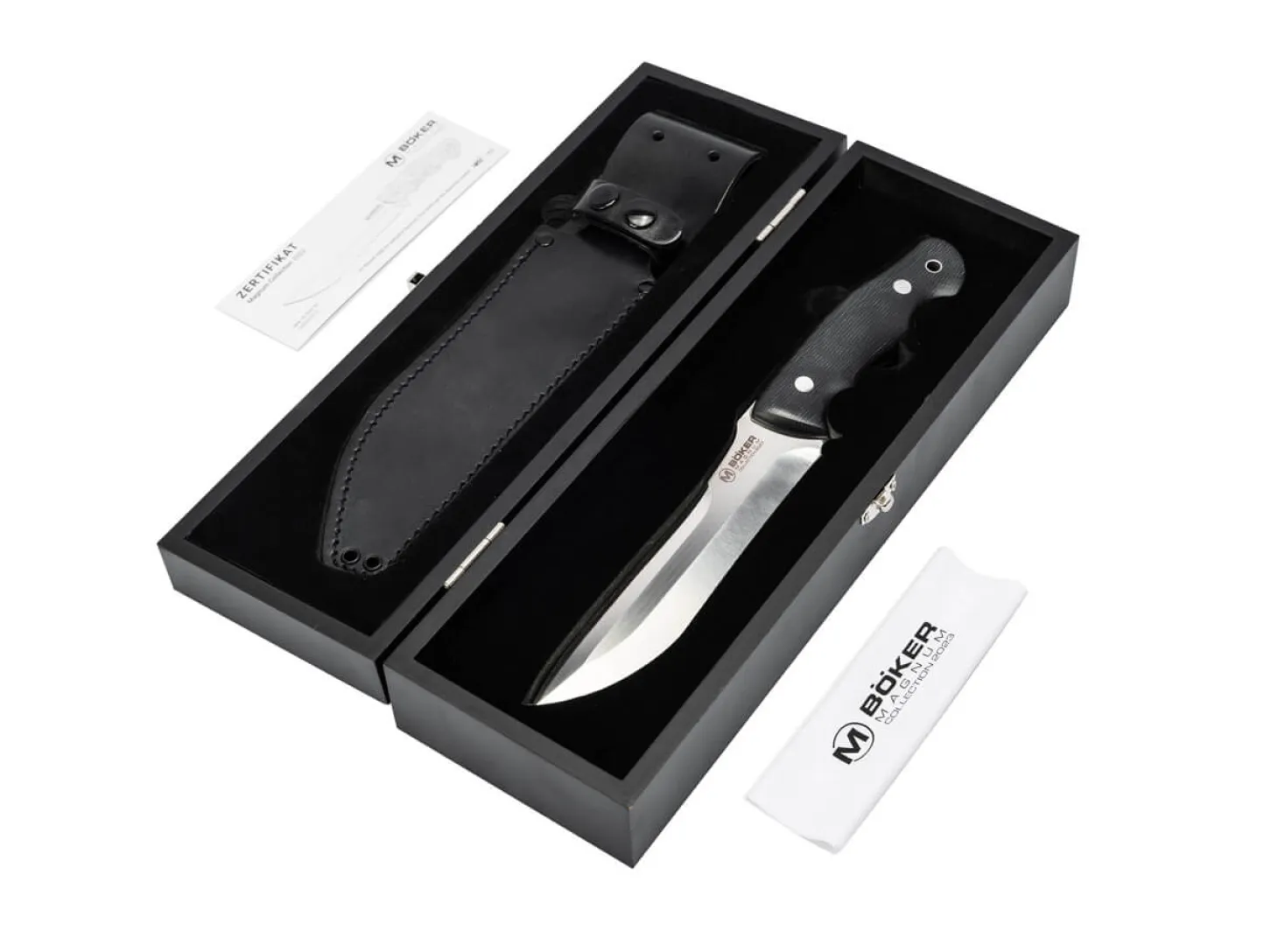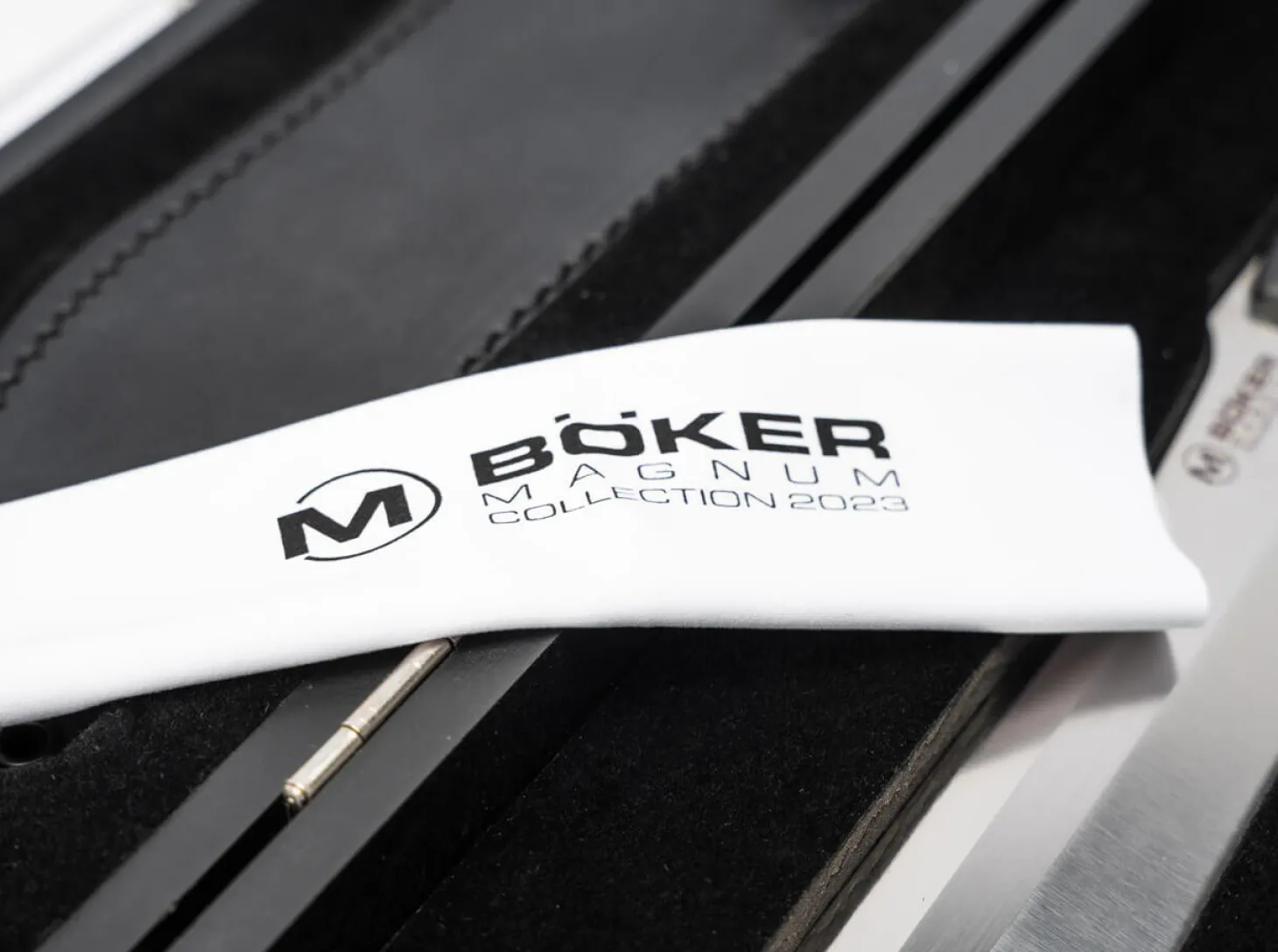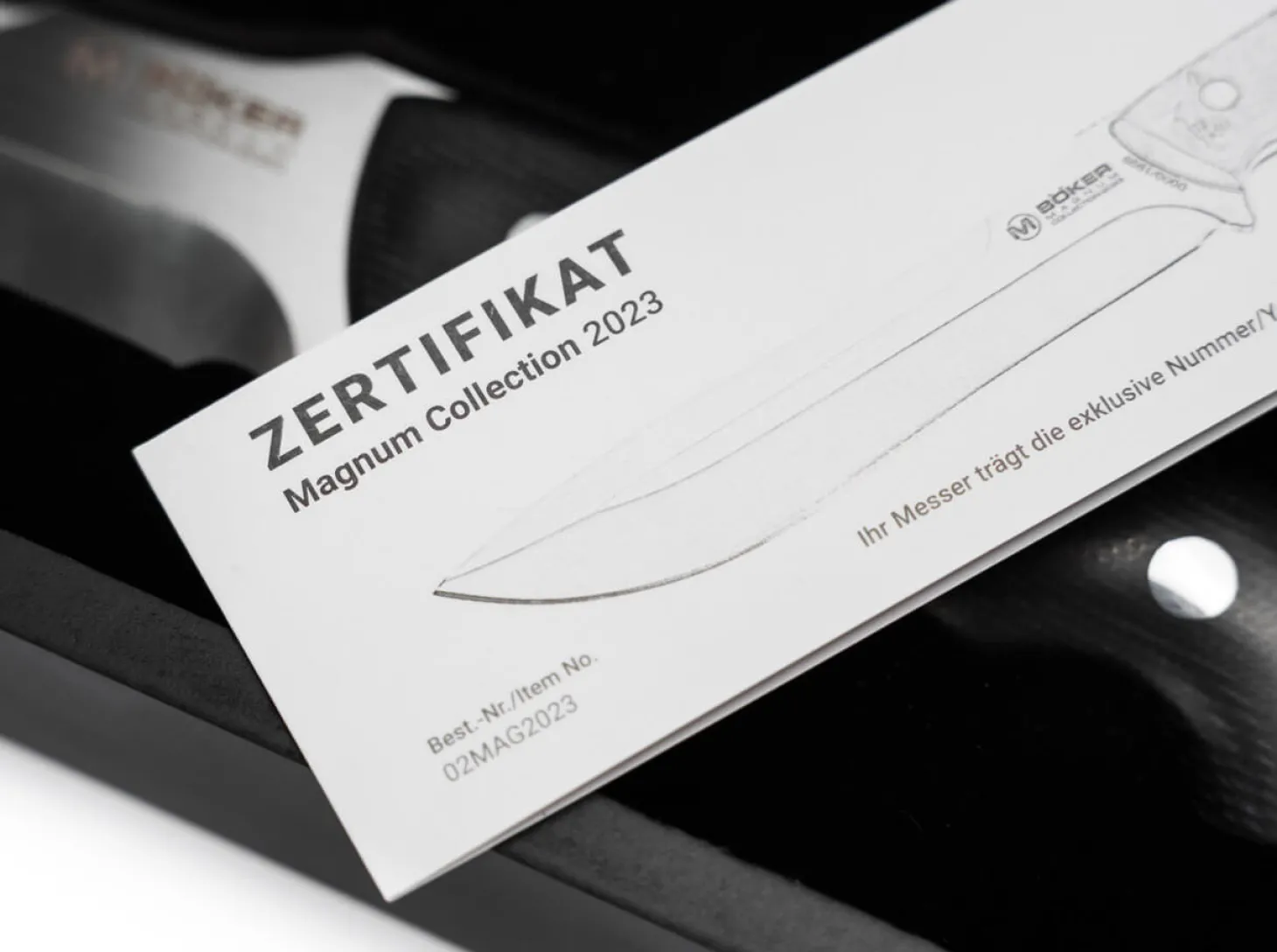 Magnum setzt die Tradition seiner Jahresmesser fort und präsentiert mit dem Collection 2023 ein Sammlermesser mit außergewöhnlicher Strahlkraft. Begeisterte Messersammler auf der ganzen Welt werden wieder vor die Wahl gestellt, ob das Messer nun seinen Platz in der Vitrine oder am Gürtel finden soll. Für dieses besondere Projekt konnte Lucas Burnley gewonnen werden, der als einer der renommiertesten Messerdesigner der Welt gilt und bereits erfolgreiche Messerserien für Böker und Böker Plus aus der Taufe gehoben hat. Der Messermacher aus dem US-Bundestaat Oregon versteht es wie kaum eine andere, klare Linie mit taktischen Einflüssen in seinen Entwürfen zu vereinen. Das Magnum Collection 2023 überzeugt als imposantes Vollerl-Outdoormesser mit einer wuchtigen Klinge aus D2, die mit einer ausgeprägten Fehlschärfe sowie einem außergewöhnlichen Two-Tone Finish versehen ist. Dabei changiert der Designer zwischen einem horizontalen und vertikal gezogenen Hairline-Finish auf der Klinge, was den besonderen Reiz des Fahrtenmessers unterstreicht. Die Liebe zum Detail setzt sich auch im konturierten Griff fort. Perfekte Haptik, ermüdungsfreies Arbeiten und ein edler Look – die schwarzen Griffschalen aus poliertem Micarta sprechen ihre eigene Sprache. Im Lieferumfang enthalten sind eine hochwertige Lederscheide mit zwei Druckknöpfen zur Sicherung, eine exklusive Sammlerschatulle und ein Echtheitszertifikat. Das Magnum Collection 2023 ist streng limitiert auf weltweit 1999 Exemplare.