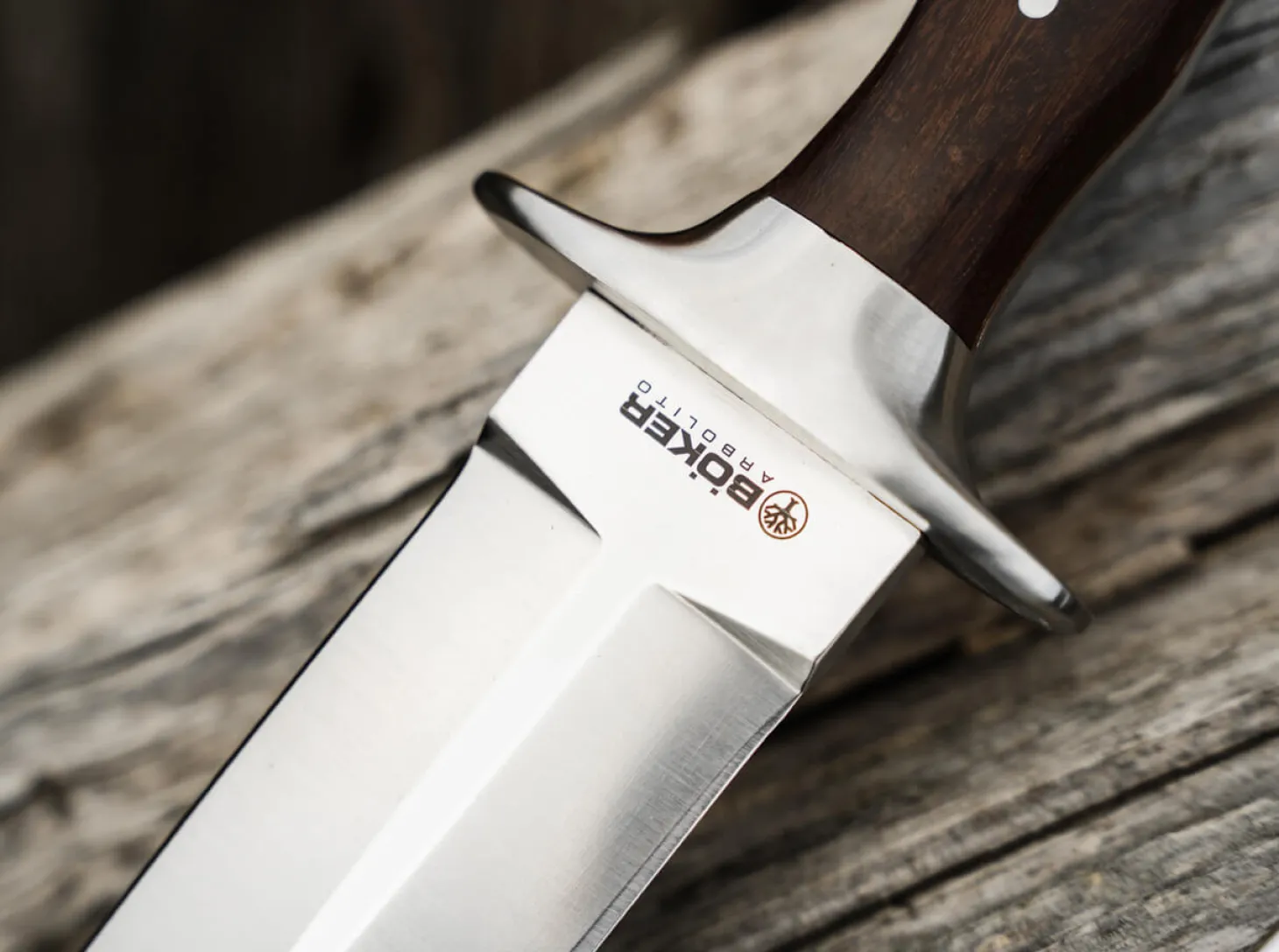 Das Böker Arbolito Colmillo ist als klassischer Hirschfänger mit einer langen Dolchklinge ausgestattet und beeindruckt mit seiner stabilen Vollerl-Bauweise sowie seiner beachtlichen Größe selbst erfahrene Jäger. Die beidseitig abgezogene Klinge aus ACX 390 ist mit einem feinen Satin-Finish versehen, der ausladende Handschutz besteht aus Neusilber. Für die ergonomisch geformten Griffschalen kommt edles Guayacan-Ebenholz zum Einsatz, das mit den Neusilbernieten im Griff die traditionelle Anmutung des feststehenden Jagdmessers zusätzlich unterstreicht. Mit Fangriemenöse und hochwertiger Gürtelscheide aus braunem Leder.