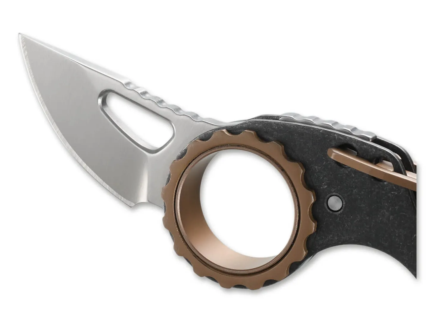 Mit dem CRKT Compano ist Designer Mike Bond ein außergewöhnlicher Wurf gelungen. Das Slipjoint-Messer mit 5Cr15MoV Klinge fällt insbesondere durch seinen Edelstahlgriff im Black Stonewash-Finish auf, der gleichzeitig als Karabiner genutzt werden kann. Farbliche Akzente setzen das in Bronze gehaltenen Klingendrehgelenk und der Schnapper.