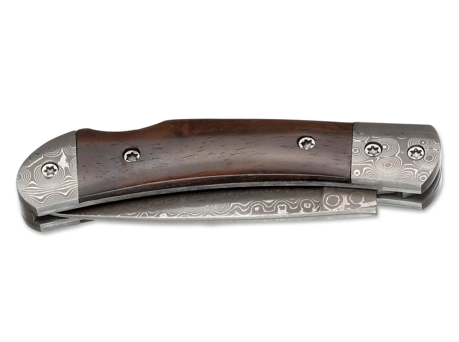 Ein hochwertiges und elegantes Messer. Die Klinge und der Backen bestehen aus 37 Lagen Damast. Der Griff ist aus dem dunkel gemaserten Ebenholz gefertigt, das ausgezeichnet zu dem exquisiten Auftritt dieses Messers passt. Die Klinge verfügt über einen Nagelhau und einen Backlock-Verschluss. Ein edles Messer, das auch im Alltag mit seiner Zuverlässigkeit begeistert.