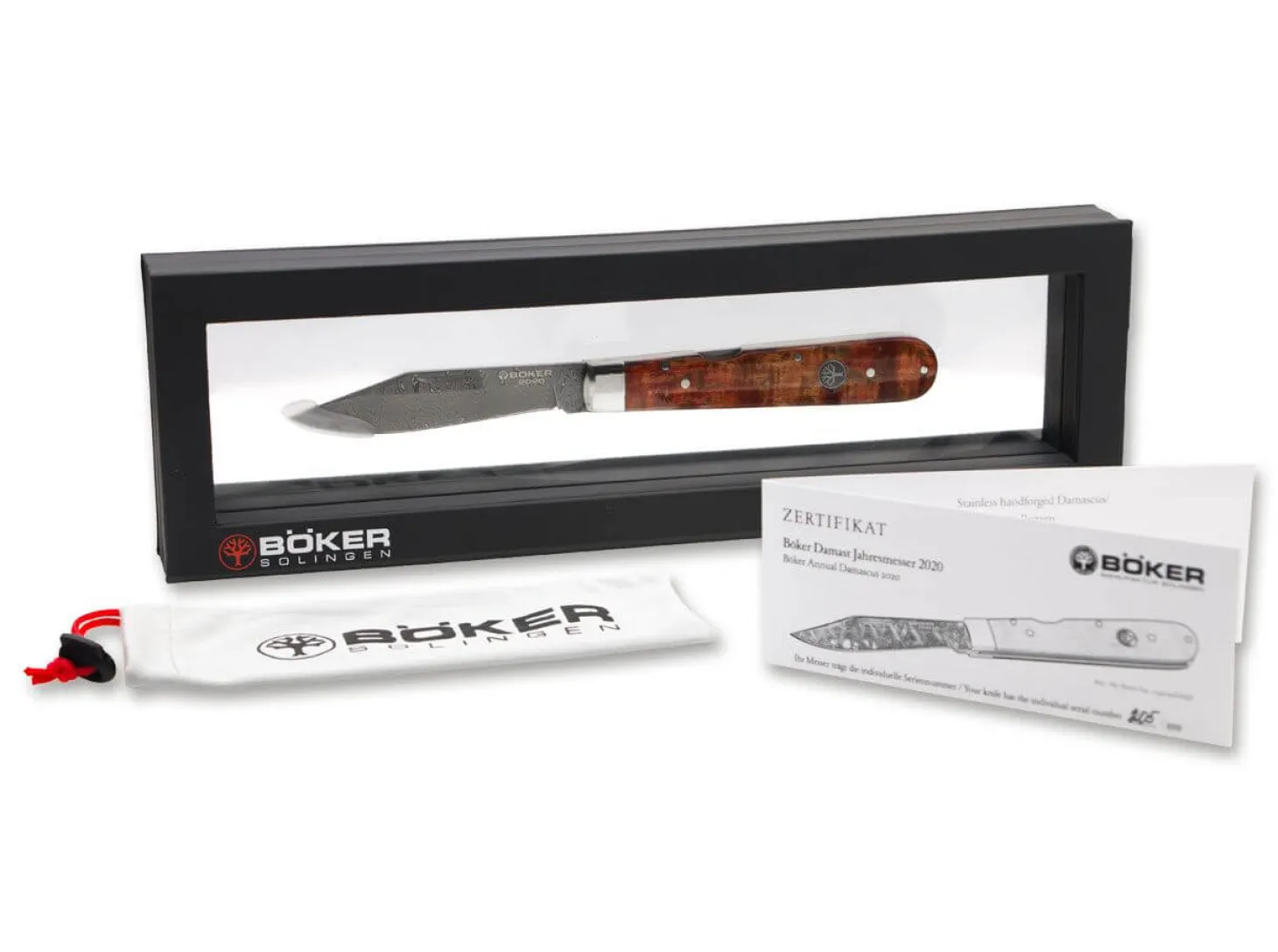 Die Wahl für das Böker Damast Jahresmesser 2020 fiel auf das Modell 1906, einen echten Modern Traditional. Die Neuauflage des Messerentwurfs aus der vorletzten Jahrhundertwende trifft den aktuellen Zeitgeist und ist überaus beliebt. Es ist ein sehr charismatisches Taschenmesser, dessen besondere Erscheinung insbesondere durch die Geradlinigkeit, die klaren Linienführung und den typischen Klingenschliff geprägt ist.Die Platinen werden ganz klassisch aus Messing gefertigt, während die Backen aus Neusilber bestehen. Die Klinge aus handgeschmiedetem, rostfreiem Damascus von Chad Nichols aus Mississippi in den USA überzeugt mit 200 Lagen und dem Damascusmuster Scrambled. Sie verriegelt sicher per Backlock und harmoniert prächtig mit den fein gemaserten Holzschalen aus Maserbirke, die im edlen Farbton Amboina-Rot gebeizt sind. Mit dem neu aufgelegten historischen Boker Baumzeichen-Emblem. Von Hand gefertigt in der Boker Manufaktur in Solingen und weltweit streng auf 999 Exemplare limitiert. Auslieferung mit edlem Schwebedisplay, Echtheitszertifikat und individueller Seriennummer.