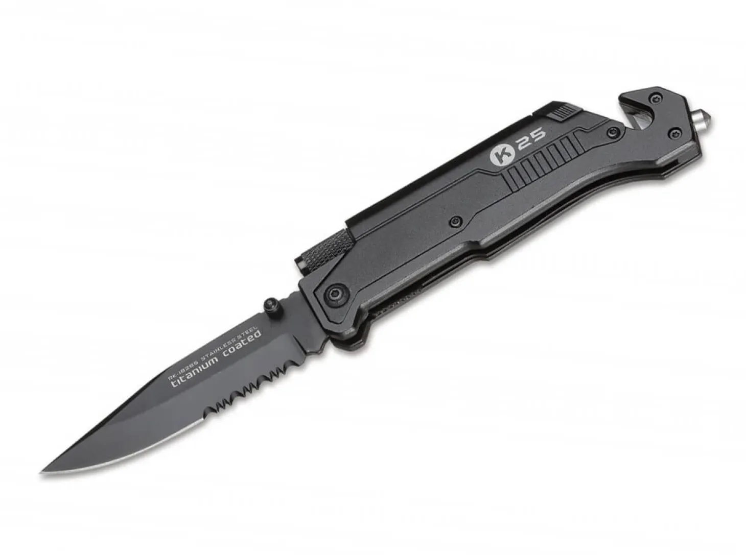 Mit dem K25 Emergency stehen Sie nie im Dunkeln, denn im Griffrücken ist eine kleine LED Lampe angebracht, die hell genug für eine Ausleuchtung des Nahbereiches ist. Das Emergency ist ein echter Allrounder und deckt sämtliche Einsatzbereiche ab. Die Klinge aus 8Cr13MoV ist mit einem partiellen Wellenschliff versehen und wird durch den Linerlock gesichert. Auch als Rettungsmesser macht es dank des Gurtschneiders und des Glasbrechers eine sehr gute Figur. Und in einer echten Survival-Situation hilft der in den Griff integrierte Feuerstarter, ein wärmendes Feuer in Gang zu bringen. Auslieferung mit Nylon-Gürteletui.