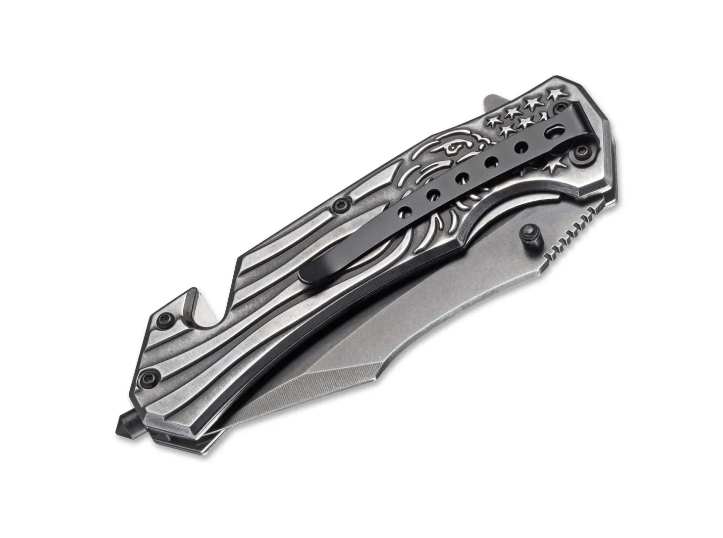 Beeindruckendes Messer, das stolz das amerikanische Wappentier, den Weißkopfseeadler, und die amerikanische Flagge mit Stars and Stripes präsentiert. Der stabile Griff verdankt seine Stärke dem verwendeten Edelstahl. Die 440er Klinge kann entweder per Daumenpin oder Flipper geöffnet werden. Die zusätzlichen Features wie Glasbrecher, Gurtschneider und Clip verleihen dem Freedom Folder die multifunktionale Einsatzbereitschaft.