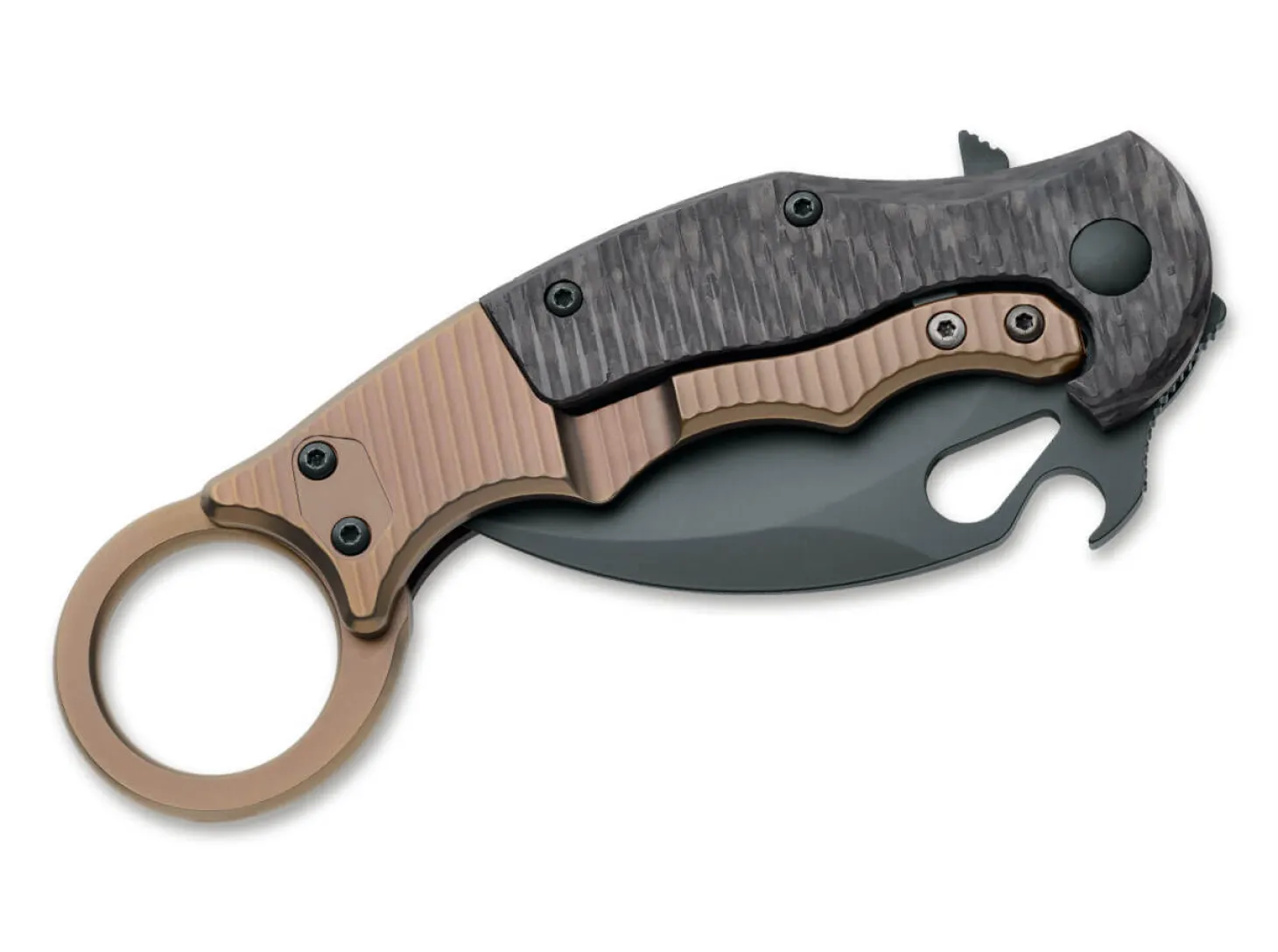Die Edelversion des überaus beliebten Fox Karambit ist mit seiner Bauweise als Titan-Framelock auf maximale Stabilität ausgelegt, wobei die geniale Hybridbauweise aus Kohlefaser und Titan der rückwärtigen Schale und die komplett aus Kohlefaser gefertigte Vorderschale dennoch für einen echten Leichtbau sorgt. So ist das Karambit Titan nicht nur technisch ein echter Leckerbissen, sondern auch optisch eine absolute Augenweide für alle Fans des modernen Klappmesserbaus. Als Klingenstahl kommt hier Elmax zum Einsatz und sorgt für die Schnitthaltigkeit. Umsetzbarer Clip. Mit einer schwarz PVD-beschichteten Klinge und coyotefarben beschichtetem Griffelement.