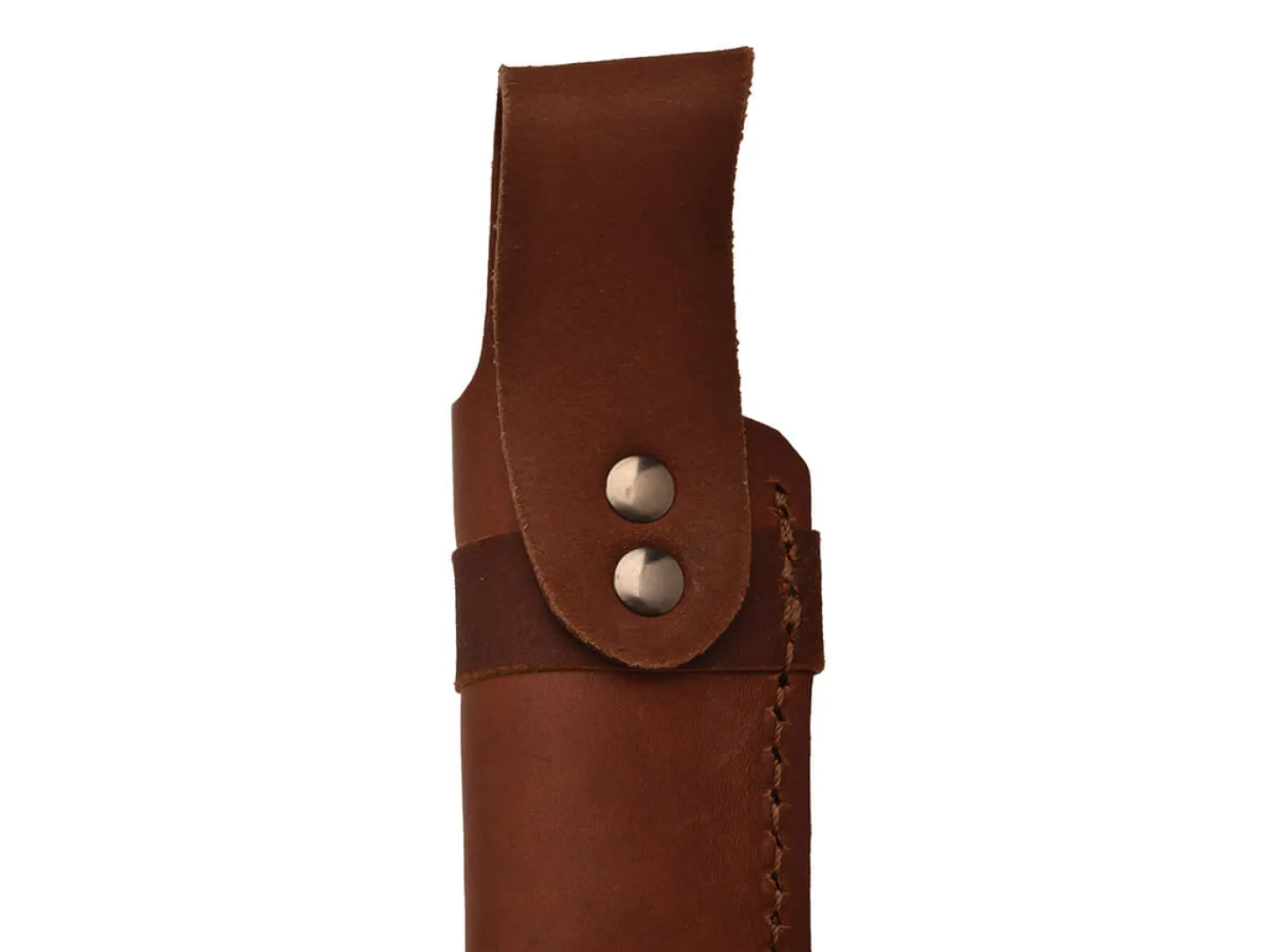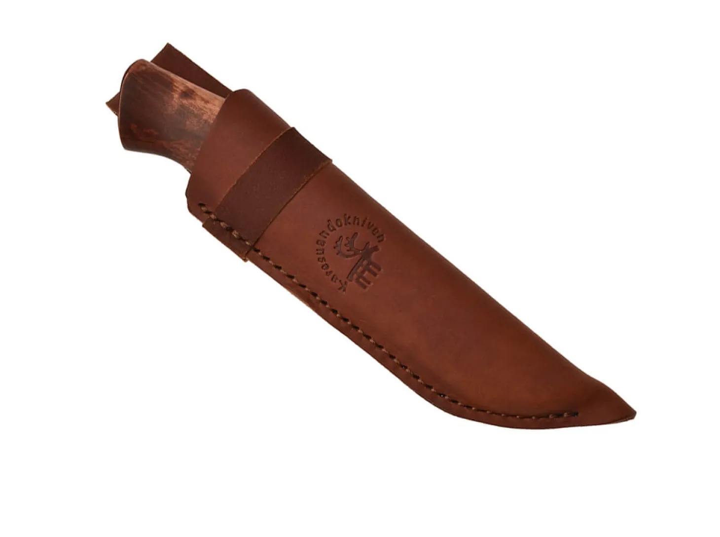Handgefertigtes Jagdmesser mit rostfreier 12C27 Klinge von Sandvik. Der Griff aus geöltem Maserbirkenholz ist mit einem Element aus Rentierhorn sowie Handschutz aus Messing versehen. Lieferumfang mit hochwertiger Lederscheide.