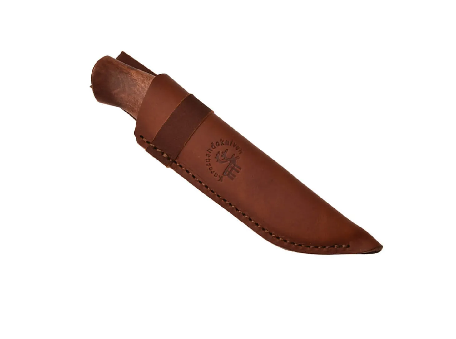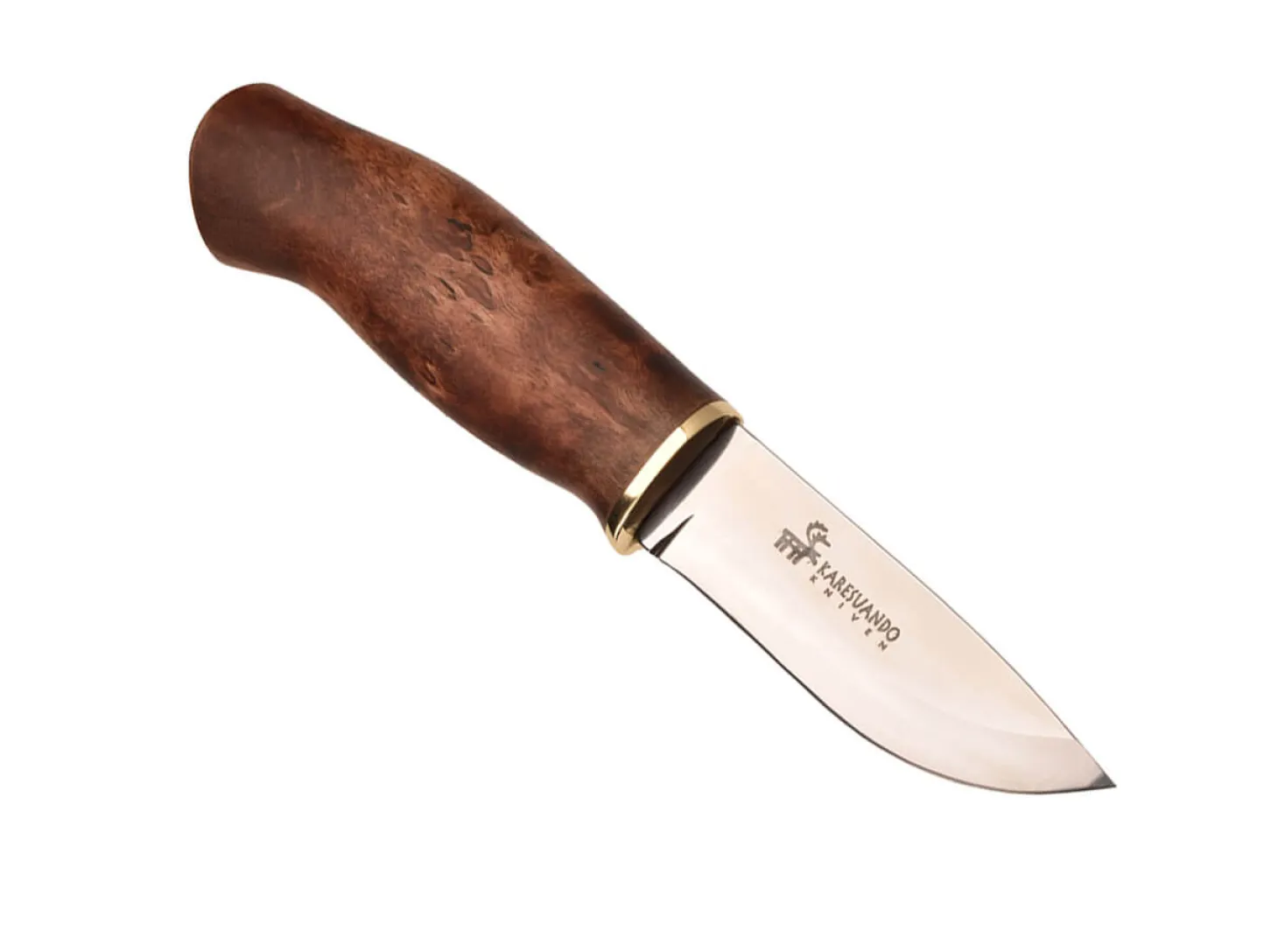 Handgefertigtes Jagdmesser mit rostfreier Klinge von Sandvik. Der Griff aus geöltem Maserbirkenholz ist mit einem Handschutz aus Messing versehen. Lieferumfang mit hochwertiger Lederscheide.