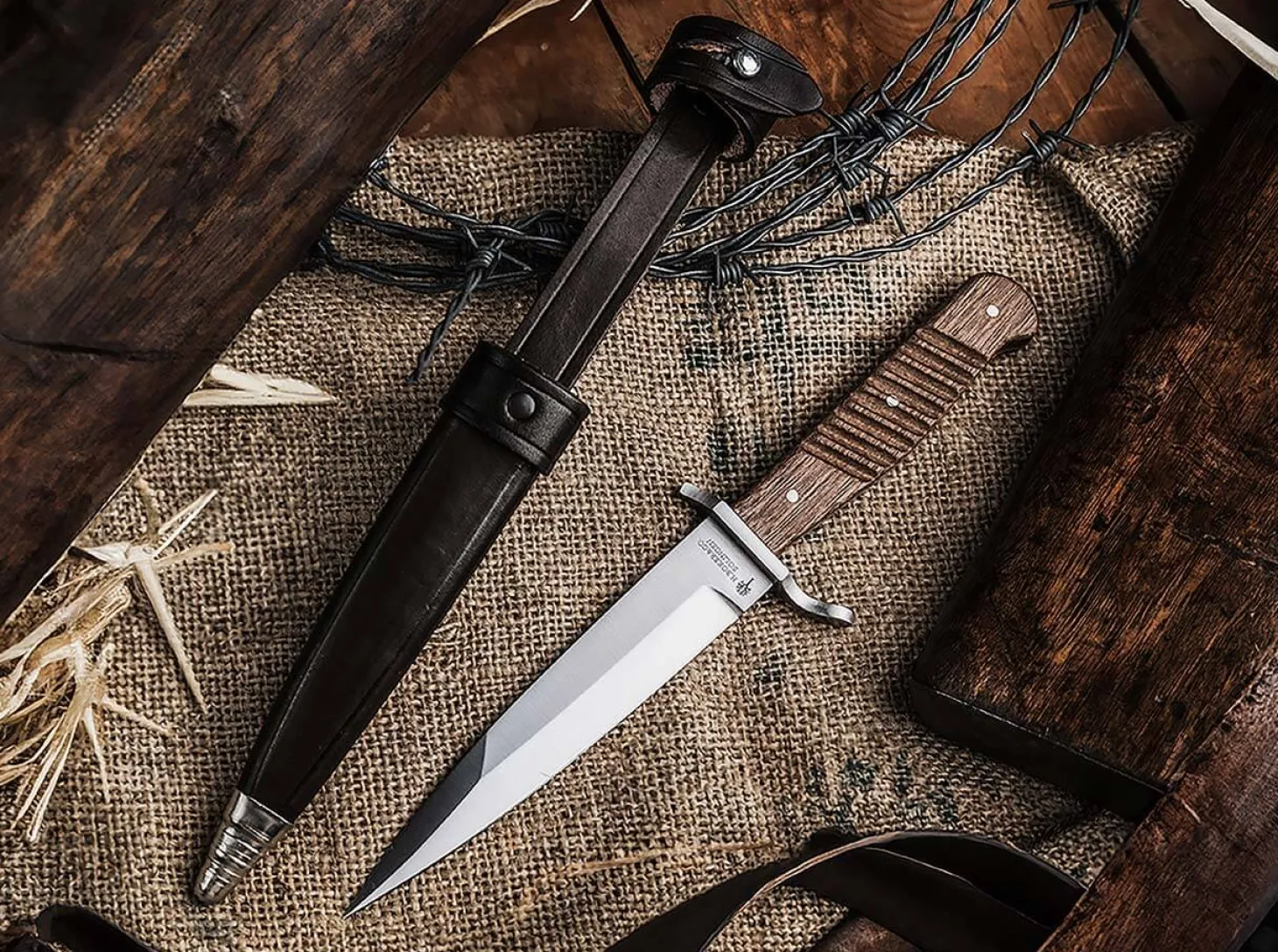 Während des Stellungskrieges im Ersten Weltkrieg und den daraus resultierenden Grabenkämpfen entwickelten viele der nur unzureichend ausgestatteten Soldaten Hilfswaffen, die in Feldschmieden und Werkstätten an und hinter der Front gefertigt wurden. Im Verlauf der Gefechte zeigte sich jedoch deutlich, dass die Ausrüstung und Bewaffnung der Soldaten nicht den Erfordernissen dieser besonderen Kampfweise entsprach. Im Jahre 1915 erhielt Böker daher den Auftrag vom Kriegsministerium, ein kompaktes Kampfmesser zu entwickeln, das sich genau für diesen Einsatzzweck bestens eignet.Die originalgetreue Neuauflage des Böker Grabendolches verfügt ebenfalls über eine nicht rostfreie Klinge, die aus C75 gefertigt wird. Dieser enorm schnitthaltige Kohlenstoffstahl benötigt heute wie damals natürlich eine entsprechende Pflege. Der massige Edelstahlhandschutz, der alte Firmenstempel auf der Klinge, die geriffelten Schalen aus heimichen Schaftholz und die authentische Scheide aus hochwertigem Leder sind ebenso Teil der Originalausstattung. Die Messer werden mit einer fortlaufenden Seriennummer gekennzeichnet.