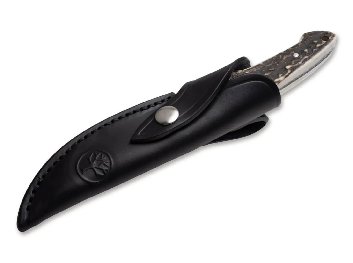 Das Böker Integral II ist die kompakte Version des Vollintegral und wird in der gleichen stabilen Bauweise aus einem Stück Stahl gesenkgeschmiedet. Die stabile Klinge und die ausgezeichnete Ergonomie der Griffschalen aus ausgesuchtem Hirschhorn überzeugen nicht nur im jagdlichen Einsatz. Der nach hinten konisch zulaufende Erl und die von Hand eingeschliffenen Fingermulden unterstreichen die aufwendige Verarbeitung und erhöhen den Griffkomfort deutlich. Die Klinge wird aus dem im Outdoorbereich bestens bewährten 440C gefertigt und ist mit einem Flachschliff versehen, der auch im harten Einsatz hohe Stabilität gewährleistet. Ausgeliefert wird das komplett von Hand in der Böker Manufaktur Solingen gefertigte Messer mit einer hochwertigen Lederscheide.