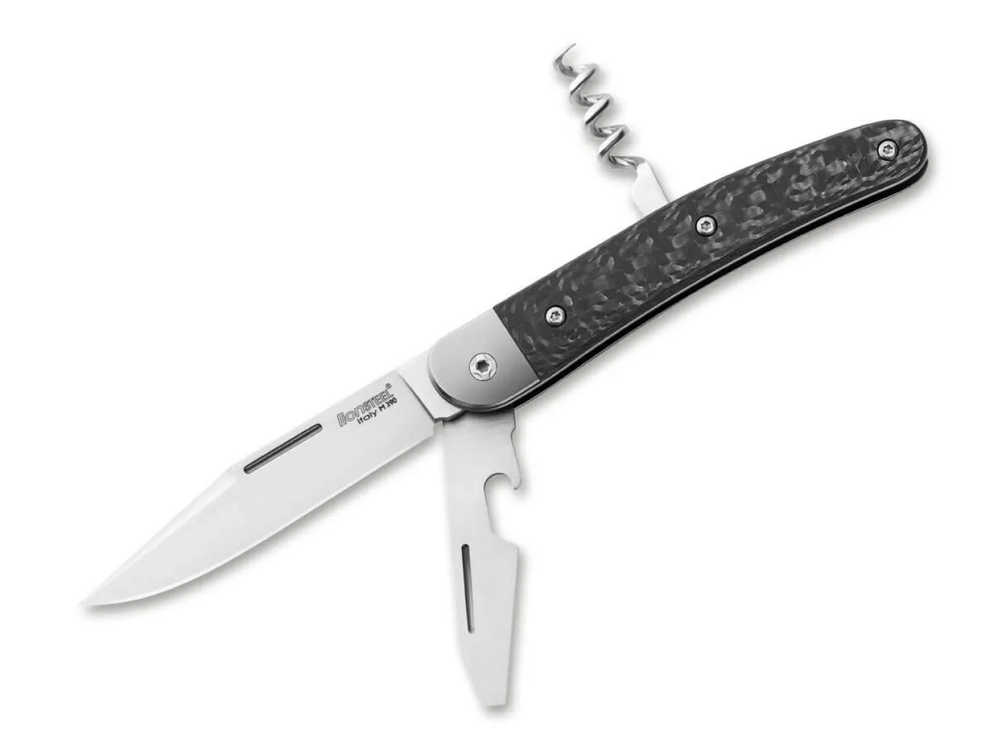 Das Jack Three ist LionSteels moderne Interpretation eines klassischen Slipjoint-Messers. Die Symbiose aus modernen Materialien mit klassischer Technik macht das Jack Three zu einem zeitlosen Alltagsmesser. Geöffnet wird die schnitthaltige Clippoint-Klinge aus M390 via Nagelhau, während der Griff aus Kohlefaser dem Messer den nötigen Halt verspricht. Die zweite Klinge enthält einen praktischen Schlitz-Schraubendreher sowie einen Kapselheber. Auch für eine gute Flasche Wein ist das Jack Three dank Korkenzieher zu haben. Liner und Backen sind aus edlem Titan gefertigt.