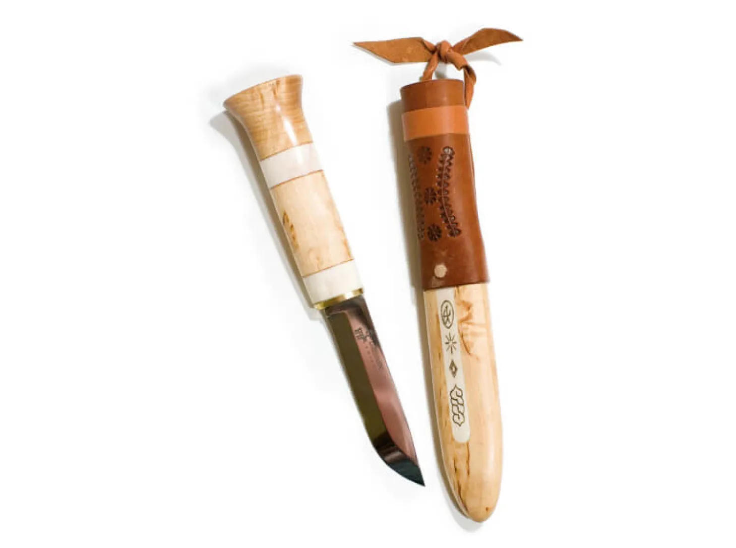 Messergriff aus Maserbirke und Rentierhorn, Klinge 21 x 100 mm aus rostfreiem Sandvik-Stahl 12C27, gehärtet auf 57HRC. Messerscheide aus Maserbirke mit Rentierhorneinlagen.