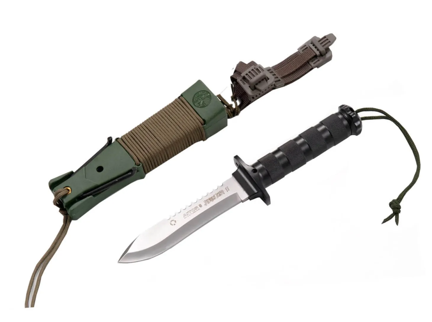 Das legendäre Aitor Jungle King II aus der beliebten Jungle King Messerserie wird von führenden Experten als eines der besten Überlebens- und Armeemesser der Welt angesehen. Design, Vielseitigkeit und die kompromisslose Funktionalität des Messers trotzen jeder noch so unwirklichen Bedingung in der Natur. Die Spearpoint-Klinge aus MoVa ist mit einem Flachschliff sowie einem Sägerücken ausgestattet und sorgt damit für maximale Flexibilität im Unterholz. Im Inneren des leichten Aluminiumgriffs befindet sich ein umfangreiches Überlebens-Set mit Kompass, Angelset, Nähzeug, Pinzette, SOS-Signalpfeife, Pflaster sowie eine Skalpellklinge. Durchdacht zeigt sich ebenfalls die stabile Kunststoffscheide, die ein praktisches Skelettmesser als Backup beherbergt und mit dem mitgelieferten Gummischlauch als Steinschleuder umfunktioniert werden kann.