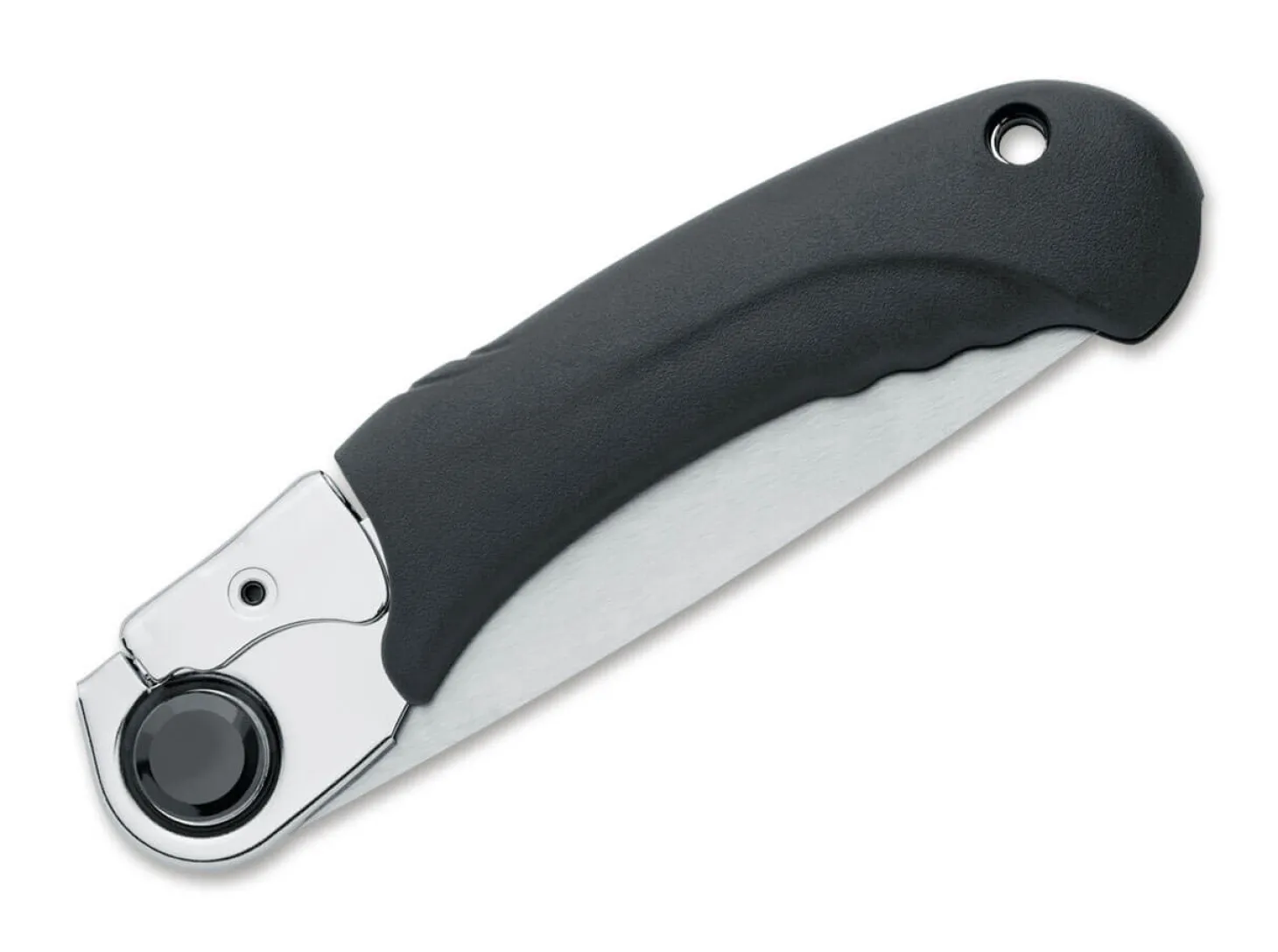 Die praktische Klappsäge 2C 361/13 auf Zug des italienischen Herstellers Due Cigni gehört in jede gut sortierte Gartenlaube. Das 13cm lange Sägeblatt aus SK-5 Kohlenstoffstahl lässt sich dabei in zwei verschiedenen Winkeln fixieren und ermöglicht so flexibles Arbeiten im heimischen Garten. Der Griff ist aus schwarzem rutschhemmenden Elastomer-Kunststoff TPR gefertigt. Die Lieferung erfolgt in einer Kunststoffbox.