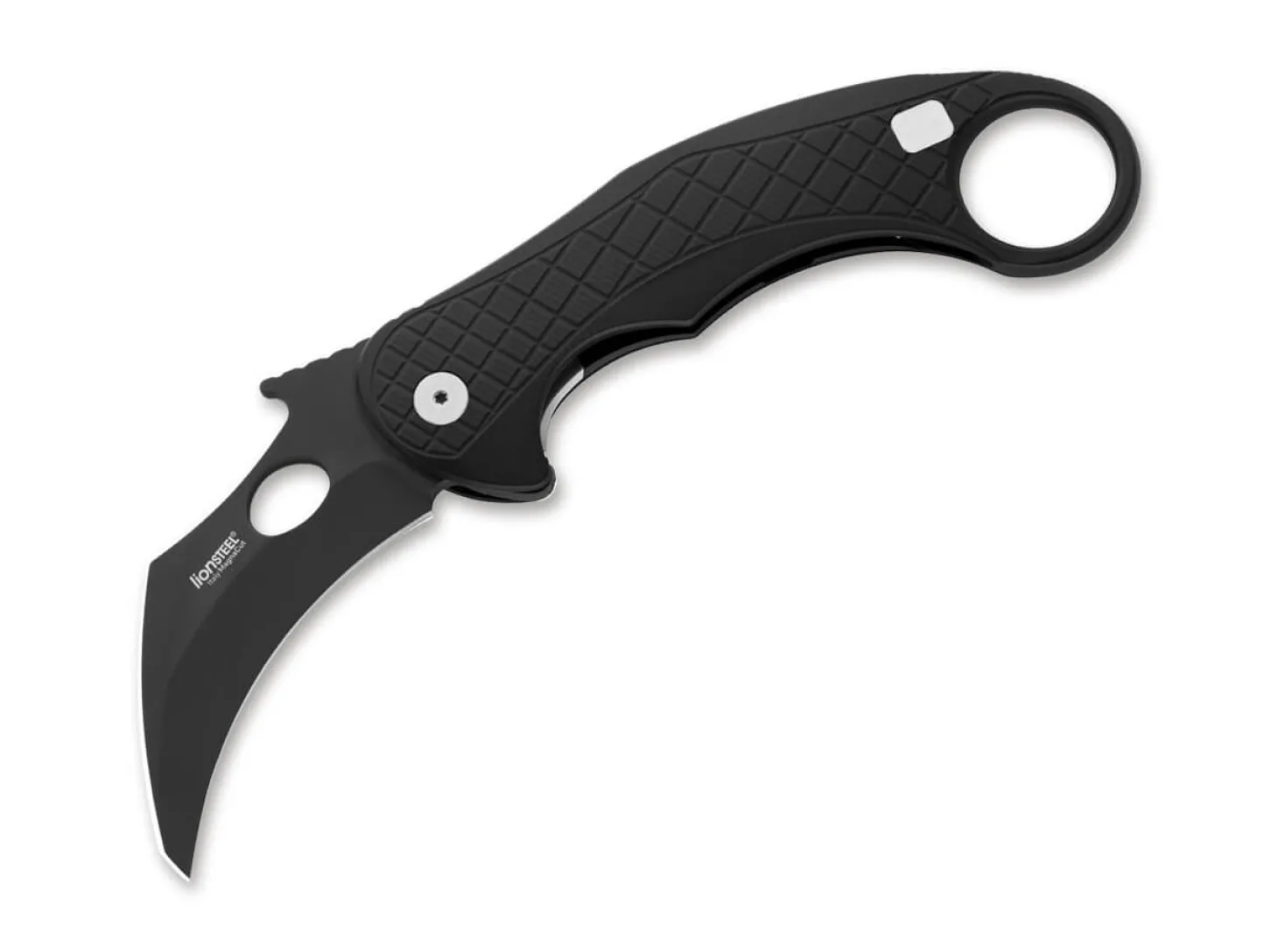 Lionsteel Emerson One, oder kurz L.E. One lautet die Bezeichnung für den majestätischen Karambit-Folder aus dem Hause lionSTEEL, der unter tatkräftiger Mitwirkung von Designer Ernest Emerson entwickelt wurde. Nicht zuletzt ist es die erhabene Anmutung des Leone (dt. Löwe), die dem Framelock-Folder seine einzigartige Anmutung verleiht. Tägliche Schneidarbeiten gelten als leichte Beute für den sichelartigen Fang aus pulvermetallurgischem MagnaCut Stahl im Black-Finish, der dank seines Rudels aus demontierbarem Flipper, Daumenöffnung oder der mähnenähnlichen Wave Öffnung über vielseitige Jagdstrategien verfügt. Der schwarze Aluminiumgriff ist aus einem Stück gefräst und weist den typischen Ring am Griffende auf. Mit Clip (Tip-up/r).