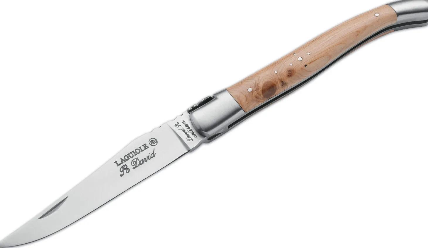 Die Heimat der weltweit bekannten Laguiole Messer liegt in Thiers, einer kleinen, seit 500 Jahren für ihre Schneidwaren berühmten Stadt in der französischen Auvergne. Ursprünglich inspiriert von Klappmessern aus Andalusien, werden dort seit Generationen die eleganten Messer mit der berühmten Biene, dem napoleonischen Wappentier, in unterschiedlichster Ausprägung gefertigt. Ideal für den täglichen Gebrauch, sind diese Messer ständige Begleiter Ihrer stolzen Besitzer und gehören inzwischen zum Ausdruck französischer Lebensart. Unter den zahlreichen Herstellern hat sich die Coutellerie Robert David internationales Renommee verschafft. Handgefertigte Laguiole Messer aus der Manufaktur Robert David überzeugen durch eine exklusive Materialauswahl, eine hohe Verarbeitungsqualität und viel Liebe zum Detail. Griff aus Wacholderholz und Backen aus Edelstahl.
