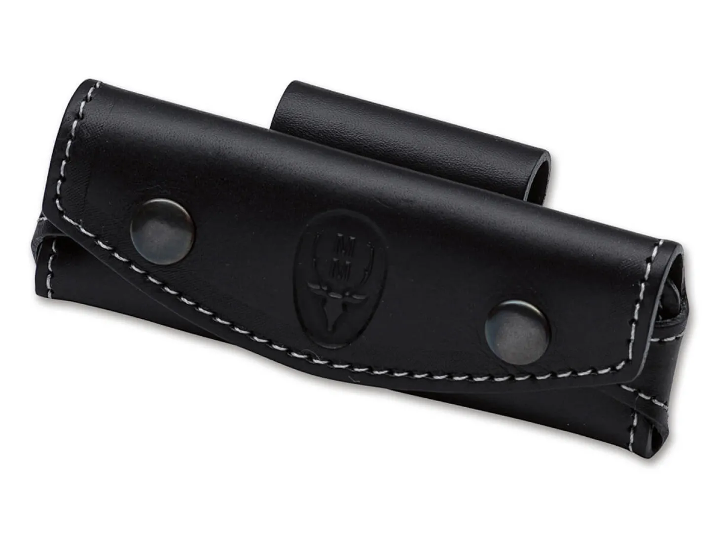 Hochwertiges schwarzes Leder-Gürteletui zum horizontalen Tragen, für Taschenmesser mit einer Heftlänge von maximal 10,5 Zentimetern. Innenmaße: 10,5 x 2,3 x 1,2 cm.