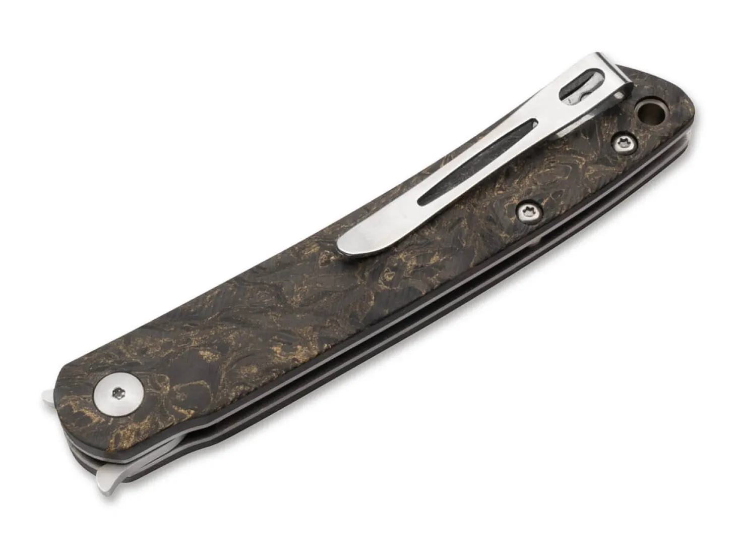 Aufrichtigkeit, Mut und Güte zählen zu den traditionellen Grundtugenden, die bis heute einen hohen Stellenwert in der japanischen Gesellschaft genießen. Messermacher Kansei Matsuno überträgt diese Werte in das Böker Plus LFL07 und erschafft ein edles Gentleman Messer voller Anmut und Stil. Ausgestattet mit einer hohlgeschliffenen Klinge aus pulvermetallurgischem CPM-S-35VN im Hairline-Finish geht das Taschenmesser jede anfallende Schneidaufgabe erhaben an. Der diskrete Frontflipper öffnet die Klinge punktgenau und geschmeidig. Blickfang und optisches Highlight des Böker Plus LFL07 ist der grau-braune Griff aus FAT Carbon, der mit goldfarbenen Schattierungen durchsetzt ist und die schlanke Linie des Klappmessers konsequent fortführt. Der Liner Lock aus Edelstahl arbeitet zuverlässig und rundet das Gesamtbild des in Europa auf 500 Exemplare limitierten Sammlermessers harmonisch ab. Der Deep-Carry-Clip aus satiniertem Edelstahl erlaubt eine Tip-Up (r) Trageweise und wird funktionell von der Fangriemenöse unterstützt.