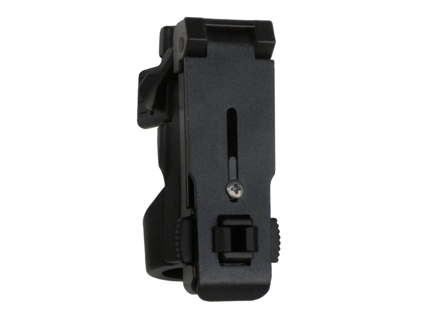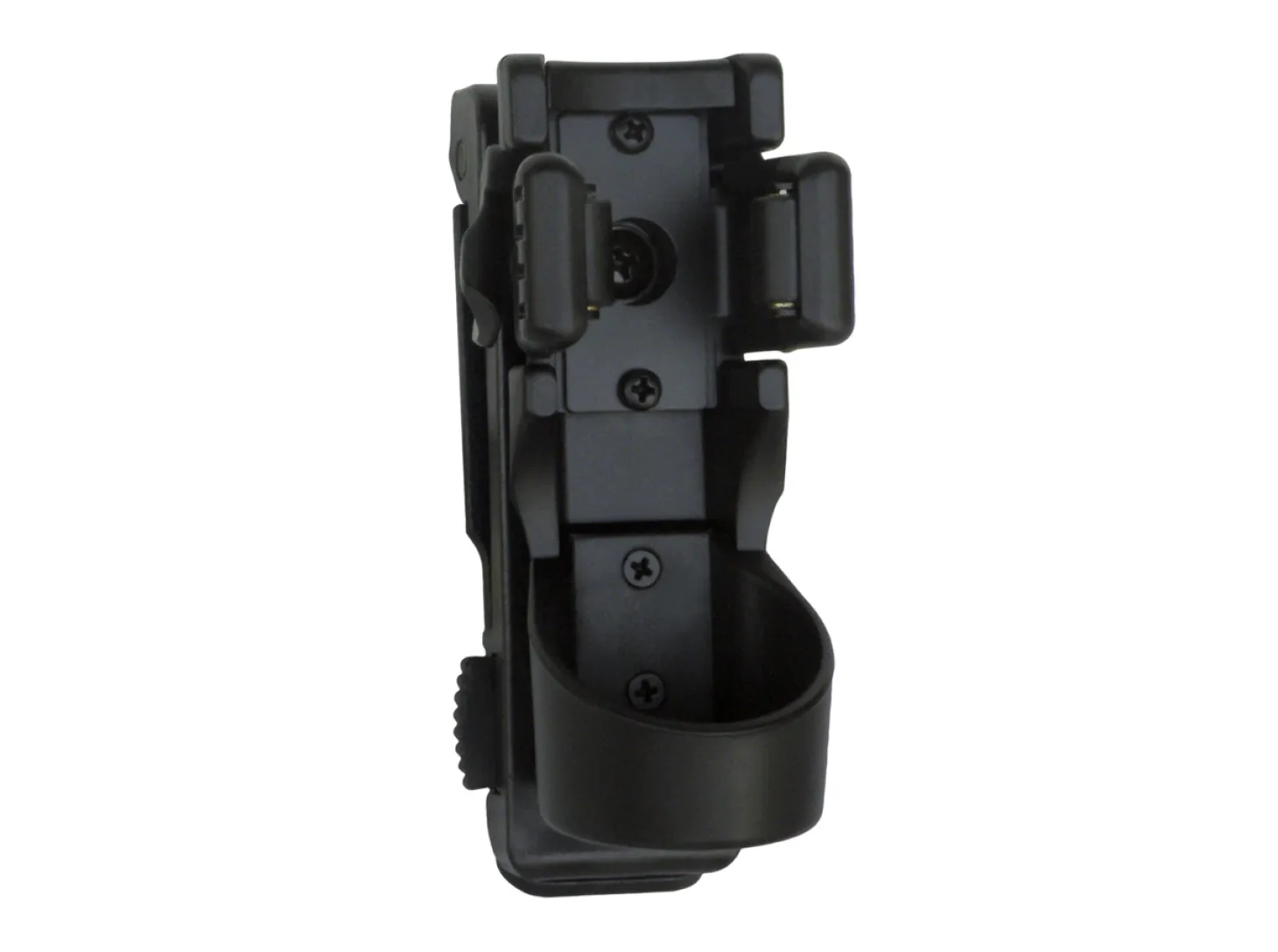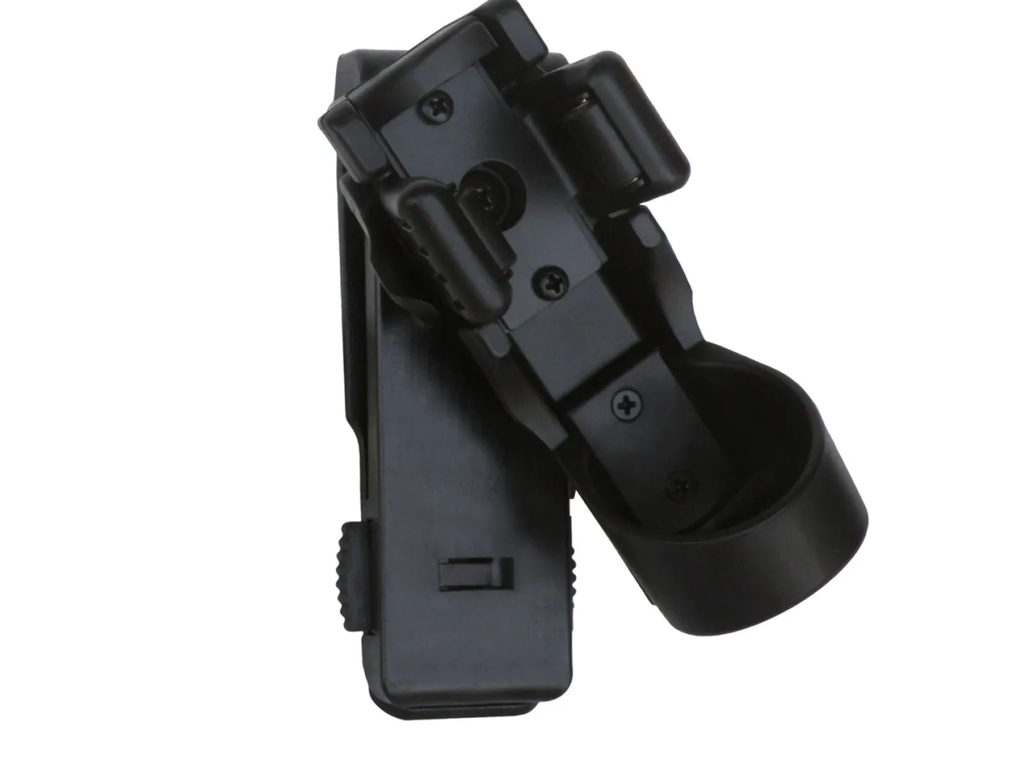 Die universelle, drehbare Taschenlampenhalterung LHU-14-37 2 ist für den professionellen Einsatz bestimmt. Sie ermöglicht ein schnelles seitliches Herauskippen der Lampe aus dem Holster und ist zudem mit einer Sicherung gegen ungewolltes Lösen der Lampe versehen. Dank des neuartigen Schnellspannclips kann die Halterung mit nur einer Hand am Gürtel befestigt werden, ohne dass dieser dafür abgenommen werden muss. Die Lampe kann am Gürtel um 360 Grad in 16 arretierbaren Positionen gedreht werden. In waagerechter oder leicht geneigter Position kann es zur dauerhaften Beleuchtung des Bereiches vor dem Anwender benutzt werden, wobei beide Hände frei sind. Die Variante LHU-14-37 (Size 2) ist für taktische Lampen mit Kopfdurchmesser bis 37 Millimeter geeignet und kann für Gürtelbreiten bis 50 Millimeter oder modifiziert auch bis 60 Millimeter verwendet werden.