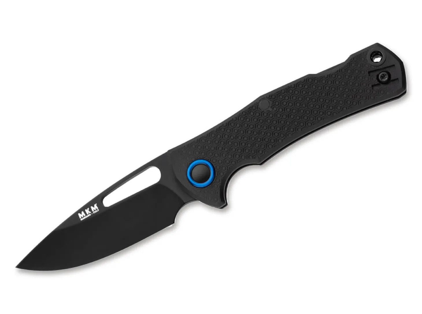 Mit viel Liebe zum Detail hat Jesper Voxnaes das komplett schwarze MKM Lov konzipiert und setzt dabei auf eine schnitthaltige N690 Klinge mit großer Daumenöffnung und Back Lock Verriegelung. Der ergonomische Griff aus FRN weist eine feine Textur auf und sorgt damit jederzeit für sicheren Halt. Der umsetzbare Drahtclip (Tip-Up) und die Fangriemenöse erhöhen den Tragekomfort und die Alltagstauglichkeit. Die Blau anodisierte Klingenachsschraube setzt einen dekorativen Akzent.