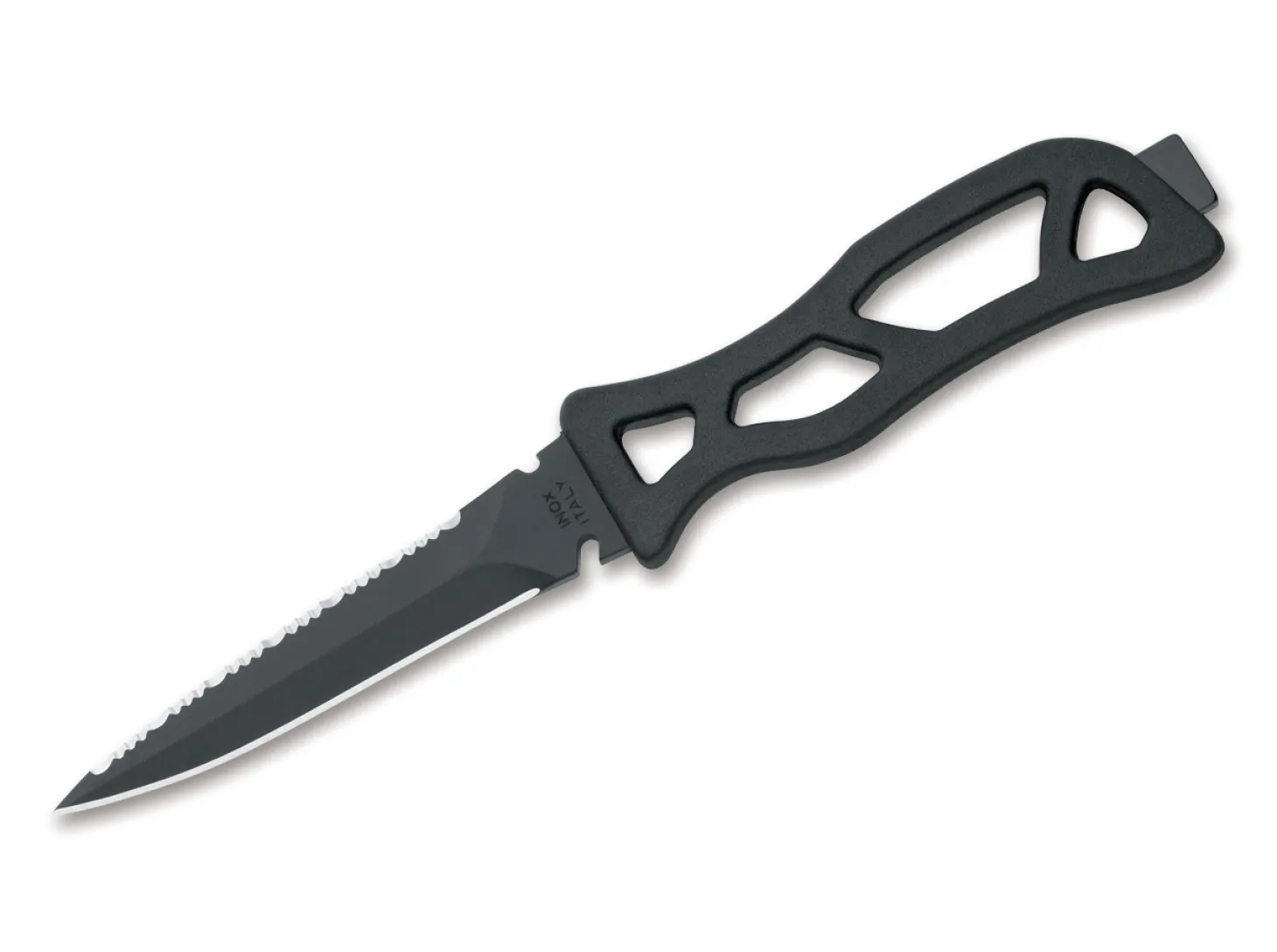 Das professionelle Tauchermesser Mako Stiletto von MAC ist mit einer besonders spitzen, abriebfest beschichteten Klinge aus 4116 ausgestattet, die zusätzlich über einen bissigen Wellenschliff verfügt. Der schwarze Griff aus rutschfestem TPE liegt auch unter Wasser sicher in der Hand. Lieferung mit PE-Scheide mit Gummibändern für Beine oder Arme.