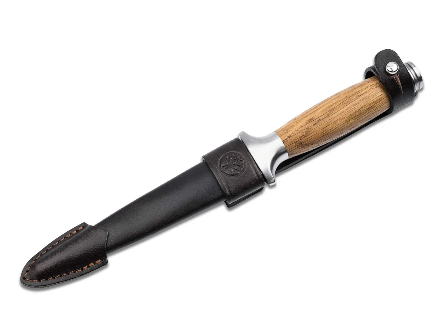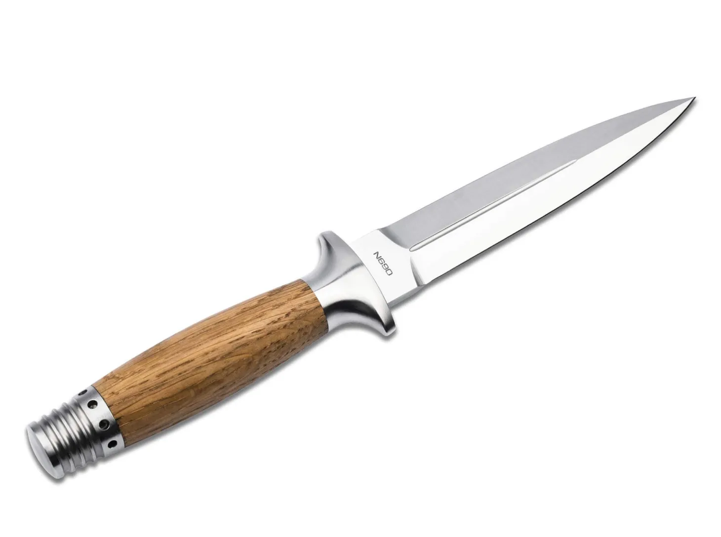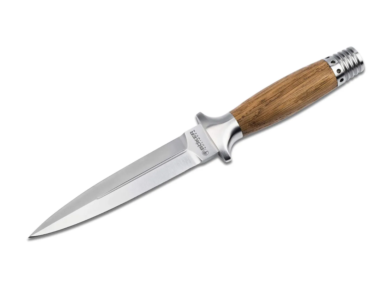 Rohstoffe und Produktionszeit waren im Verlauf des Zweiten Weltkriegs zunehmend zu kritischen und entscheidenden Faktoren geworden. Daher suchte das Heereswaffenamt einen Nachfolger für das MG-34, das in seiner Funktion bereits überzeugte, jedoch durch seine aufwändige Fertigung zu viel Zeit und Material in Anspruch nahm. Nahezu störungsfreie Funktion und Schussgenauigkeit bei jeder Witterung, der Wechsel von heißgeschossen Läufen innerhalb von Sekunden und eine Kadenz von 1.500 Schuss pro Minute (25 Schuss/Sekunde) begründeten den Ruf des neuentwickelten und optimierten MG-42. In leicht modifizierter Form ist das MG-42 noch heute als MG 3 das Standard-MG der deutschen Bundeswehr. Seltene Originale aus dem 2. Weltkrieg erzielen beim Auktionshaus Rock Island Auctions zwischen 40.000und 60.000 USD. Die beidseitig abgezogene Klinge besteht aus N690, während Knebel und Knauf des Dolches aus massivem Edelstahl gefertigt sind. Im Knauf wurden als Design-Element die Kühlrippen und Gasauslässe des Rückstoßverstärkers(eigentlich ein kombiniertes Bauteil mit den Funktionen Rückstoßverstärker, Mündungsfeuerdämpfer und Laufführungshülse) aufgenommen. Dennoch folgte auch hier die Form der Funktion, denn die Rillen erhöhen die Griffigkeit des Dolches im Reversgriff. Knebel und Knauf halten fugenlos die fassförmige Rolle aus Eichenholz, die sich durch Ihre Form automatisch in der Hand zentriert. Der Dolch ist ausgestattet mit einer hochwertigen Scheide aus dunkelbraunem Leder mit Gürtelschlaufe und Ortverstärkung. Handgefertigt in der Böker Manufaktur Solingen.