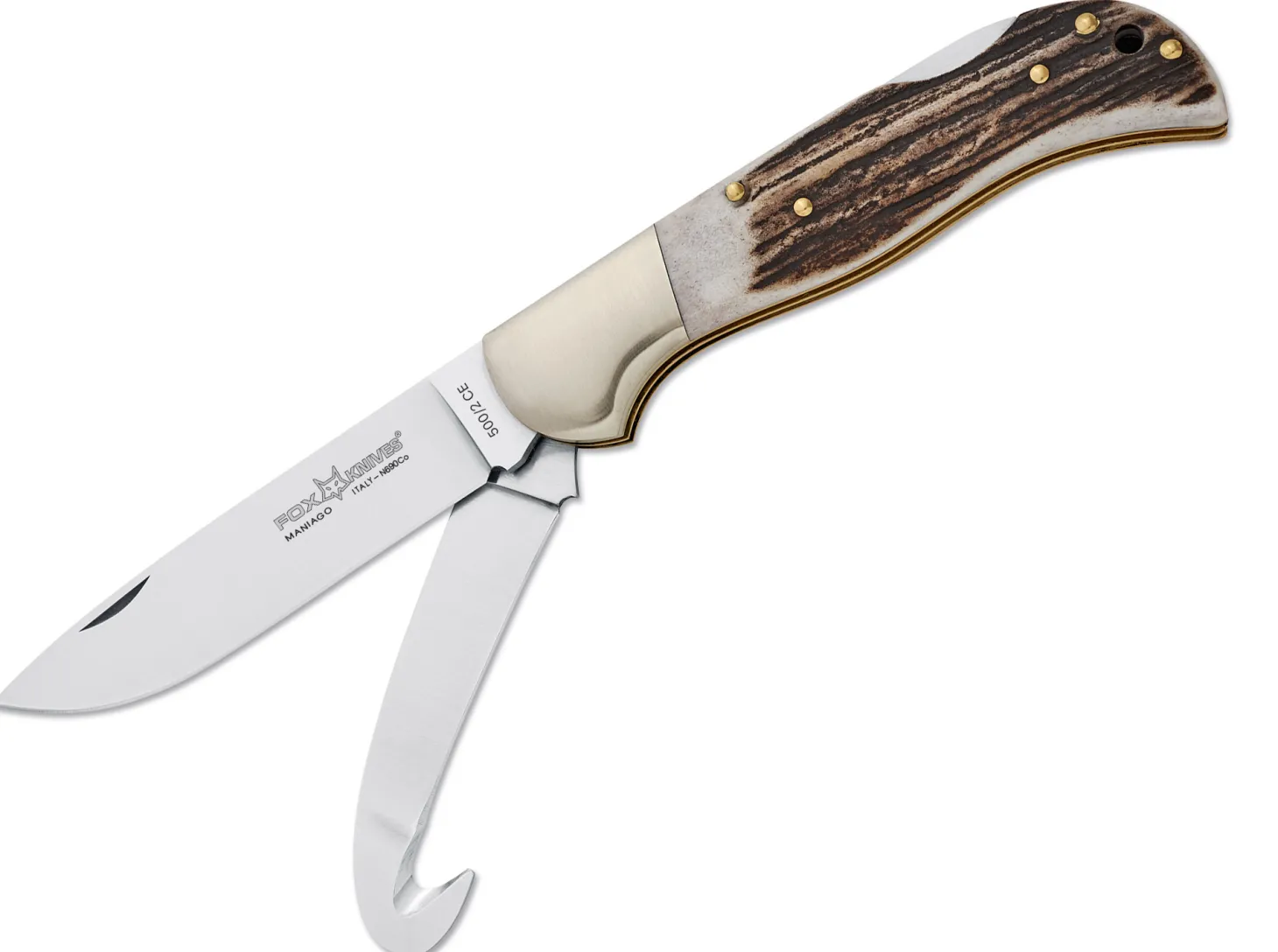 Das klassische Jagdtaschenmesser von Fox ist mit Edelstahlbacken und Hirschhornbeschalung ausgestattet. Die Hauptklinge aus N690 öffnet per Nagelhau und verriegelt per Backlock. Mit Hauptklinge und Aufbruchklinge.