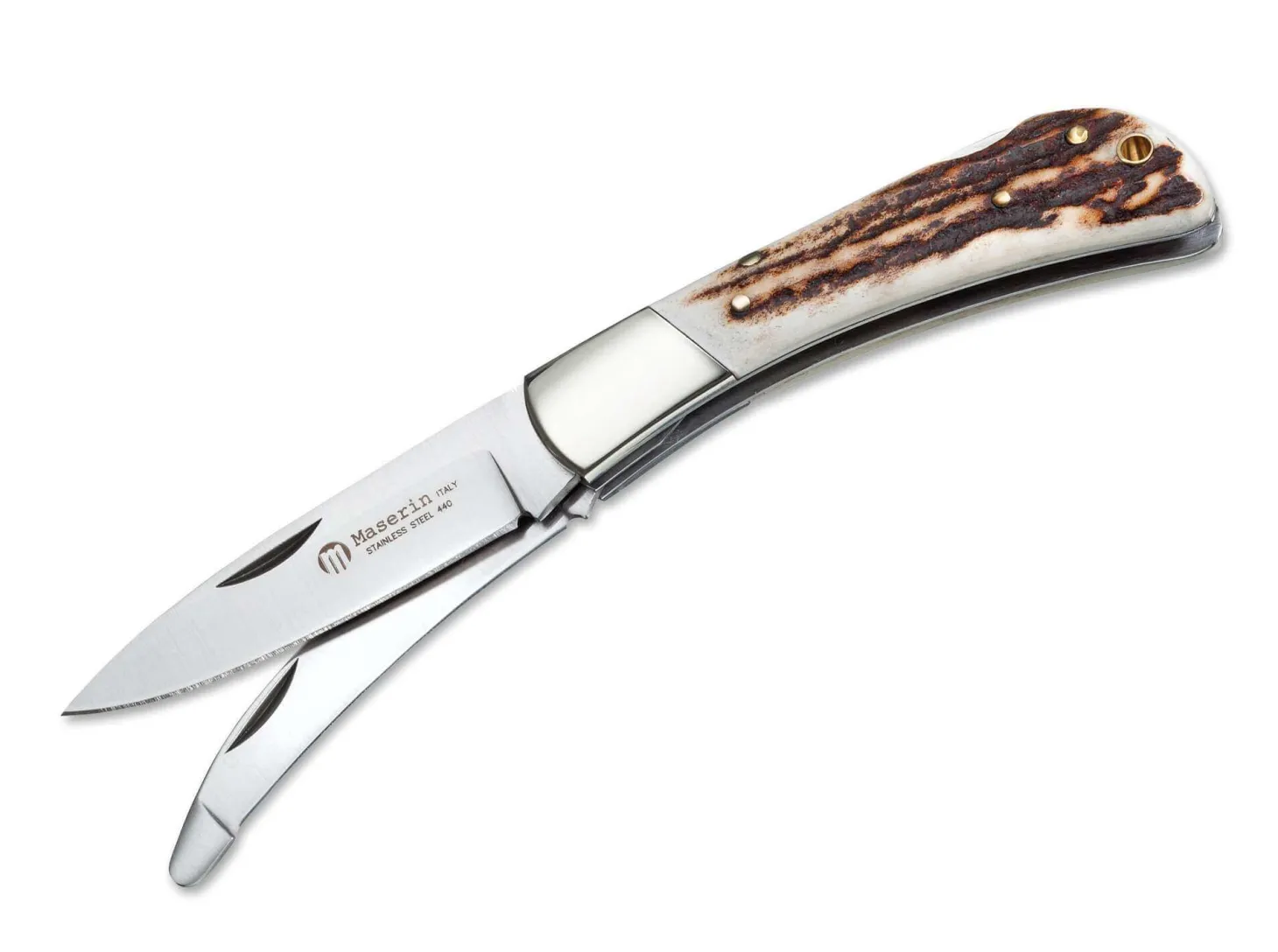 Im Bereich der traditionellen mehrteiligen Jagdtaschenmesser bietet Maserin mit dem Multiuso Caccia (Allzweckmesser für die Jagd) einen echten Klassiker. Mit Neusilberbacken, Hirschhornbeschalung, Hauptklinge und Aufbruchklinge. Klingenstahl 440 rostfrei.