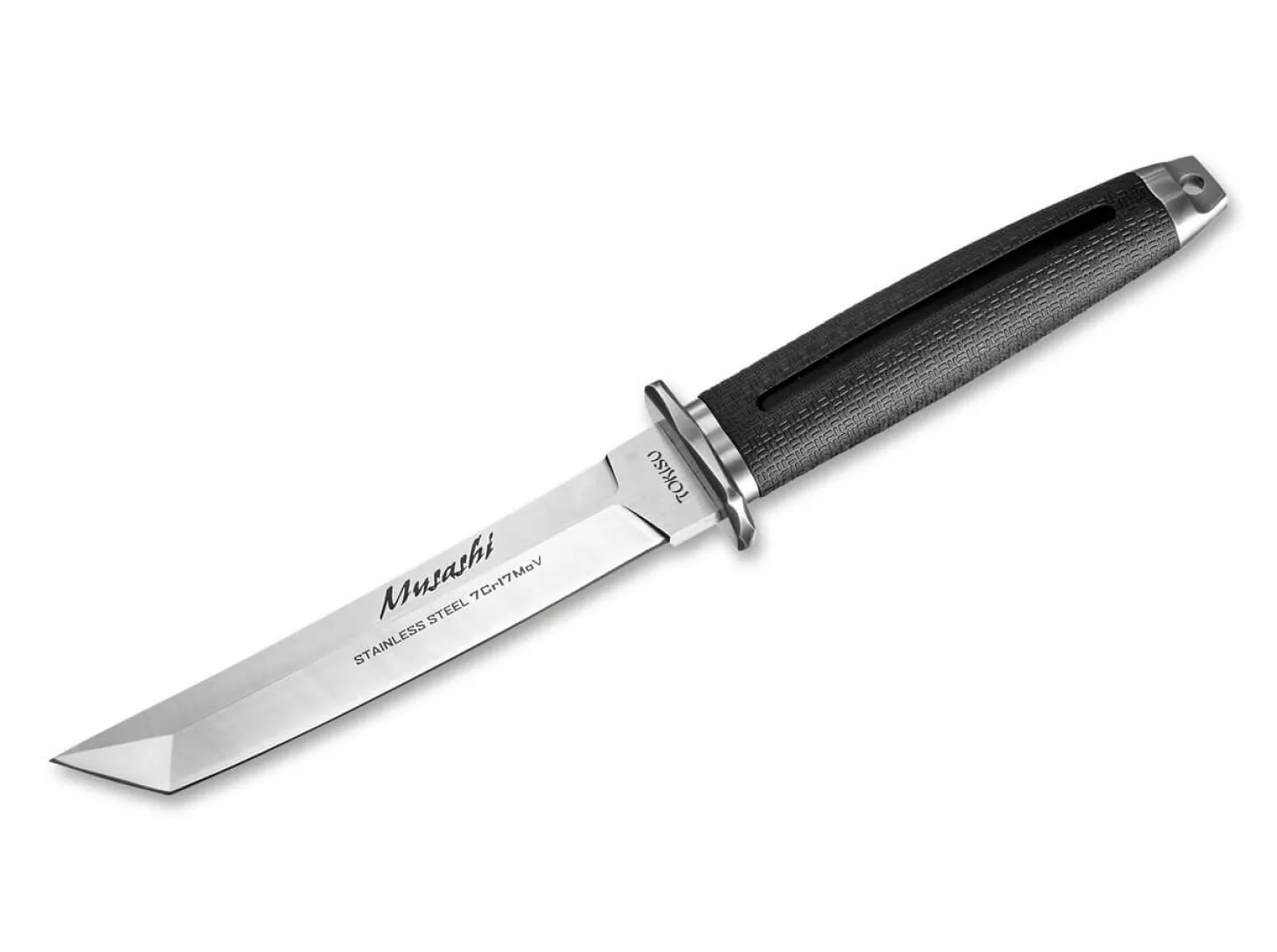 Tokisu präsentiert mit dem Musashi ein taktisches Messer mit beeindruckender Tanto-Klinge. Der Griff besteht aus texturiertem Gummi und ermöglicht eine sichere Führung der 15 Zentimeter langen Klinge aus 7Cr17MoV. Das Messer wird mit stabiler Kunststoff-Scheide und in einer dekorativer Magnet-Box ausgeliefert. Es überzeugt mit einer hochwertigen Verarbeitung und einem fairem Preis-Leistung Verhältnis. Mit Fangriemenöse.