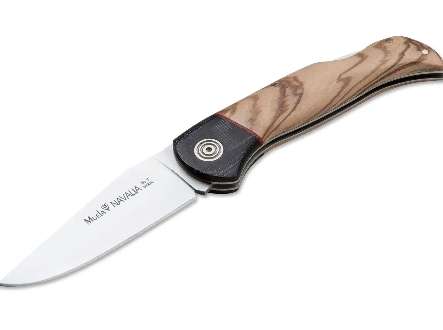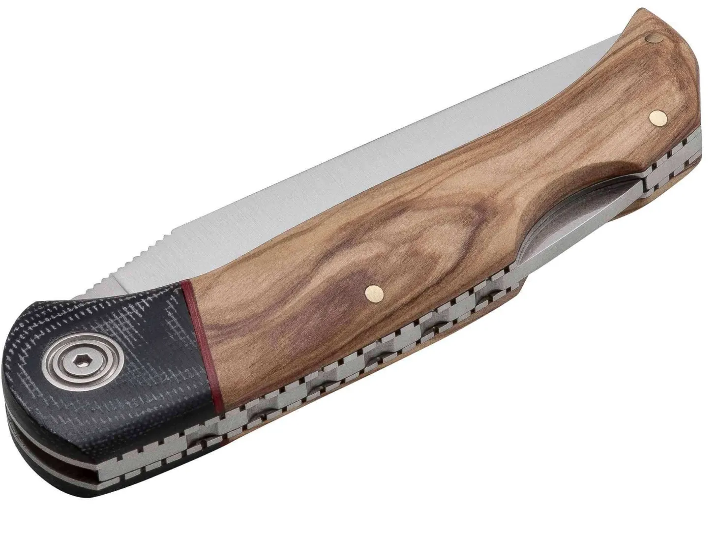 Der besondere Reiz dieser Taschenmesser besteht in der außergewöhnlichen Kombination von Olivenholz als Beschalung und schwarzem Micarta als Material für die Backe, die durch eine rote Fiberlage voneinander abgesetzt werden. Das kunstvolle Filework im Griffrücken trägt seinen Teil zur Exklusivität des Messers bei. Satinierte Klinge aus 4116-Klingenstahl.