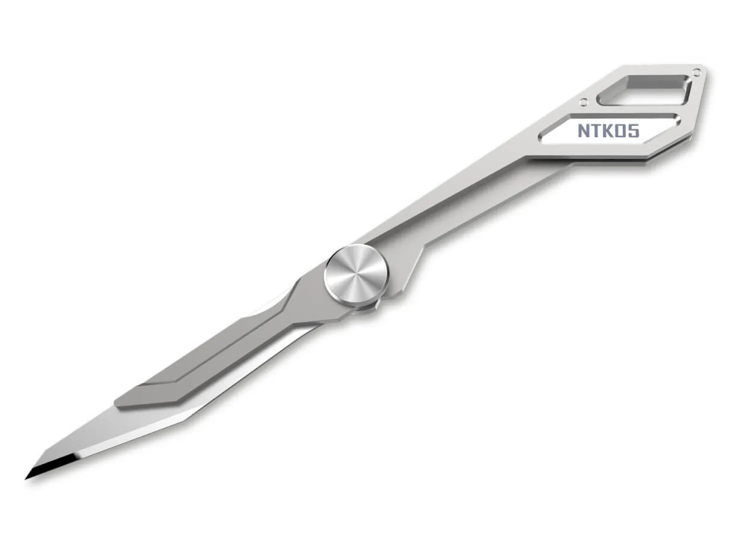 Mit dem NTK05 von Nitecore erscheint ein extrem leichtgewichtiges Messer für den Schlüsselbund. Der CNC-gefräste Griff besteht aus TC4-Titan und birgt die feine Skalpellklinge Typ 11. Sie zeichnet sich durch hervorragende Schärfe, Schnitthaltigkeit und Korrosionsbeständigkeit aus. Mit einem Gewicht von ungefähr fünf Gramm ist das Messer leichter als eine EC-Karte und damit ideal für den Schlüsselbund geeignet. Das Messer besteht nur aus sechs Einzelteilen und besticht mit einem schlichten und zeitlosen Design. Ersatzklingen vom Typ 11 sind überall im Handel erhältlich.