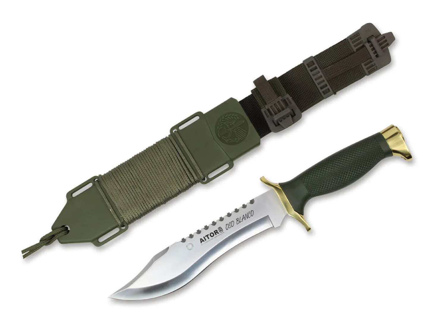 Das legendäre White Bear Messer (span. oso blanco) aus der Bear Reihe wurde für die Spezialeinheiten der spanischen Armee entwickelt und gilt unter vielen Experten als das vielseitigste Messer im Hinblick auf Ausstattung, Balance, Handhabung und Schärfe. Mit einer Härte von 55-58 HRC ist die robuste Klinge aus MoVa jeder Aufgabe gewachsen. Flachschliff und ein markanter Sägerücken sorgen für die nötige Flexibilität, während der leichte Griff aus Polyamid mit den Messingelementen an Knauf und Handschutz das optische Erscheinungsbild des Outdoor-Messers harmonisch abrunden. Lieferung mit passgenauer Kunststoffscheide.