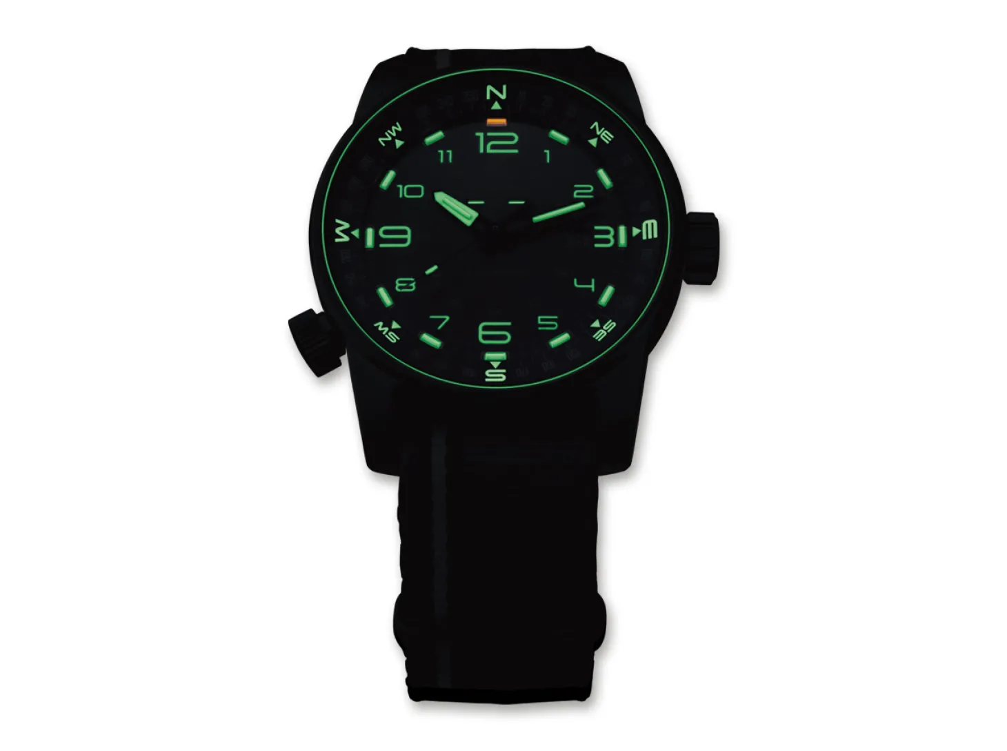 Ob im Großstadt-Dschungel, in kargen Wüstengebieten oder unterwegs auf den Weltmeeren: Die Traser P68 Pathfinder Automatic zeigt nicht nur die Zeit an, sondern auch den Weg auf. Der integrierte Kompassring macht aus dieser Uhr einen echten Pfadfinder, der seinen Träger die geographische Richtung bestimmen und dem eigenen Abenteuergeist folgen lässt. Damit die P68 für Abenteurer und Entdecker ein zuverlässiger Begleiter bleibt, garantiert die trigalight Selbstleuchttechnologie die einwandfreie Ablesbarkeit der Zeit, überall und jederzeit.Die P68 hat einen Durchmesser von 46 Millimetern und beherbergt ein Original Swiss Made Automatik Uhrwerk. Das Glas aus anti-reflektierendem Saphir besticht in Kombination mit dem Uhrengehäuse aus PVD-beschichtetem Edelstahl und verdeutlicht den hochwertigen Eindruck. Die weißen Ziffern und verschiedenfarbigen Uhrzeiger sitzen auf einem blauen Ziffernblatt. Die Himmelsrichtungen sind in Gelb gehalten und harmonisieren so mit dem mehrfarbigen NATO-Armband. Die trigalight Selbstleuchttechnologie erleuchtet Index 1 bis 11 in grüner Farbe und Index 12 in orangener Farbe.