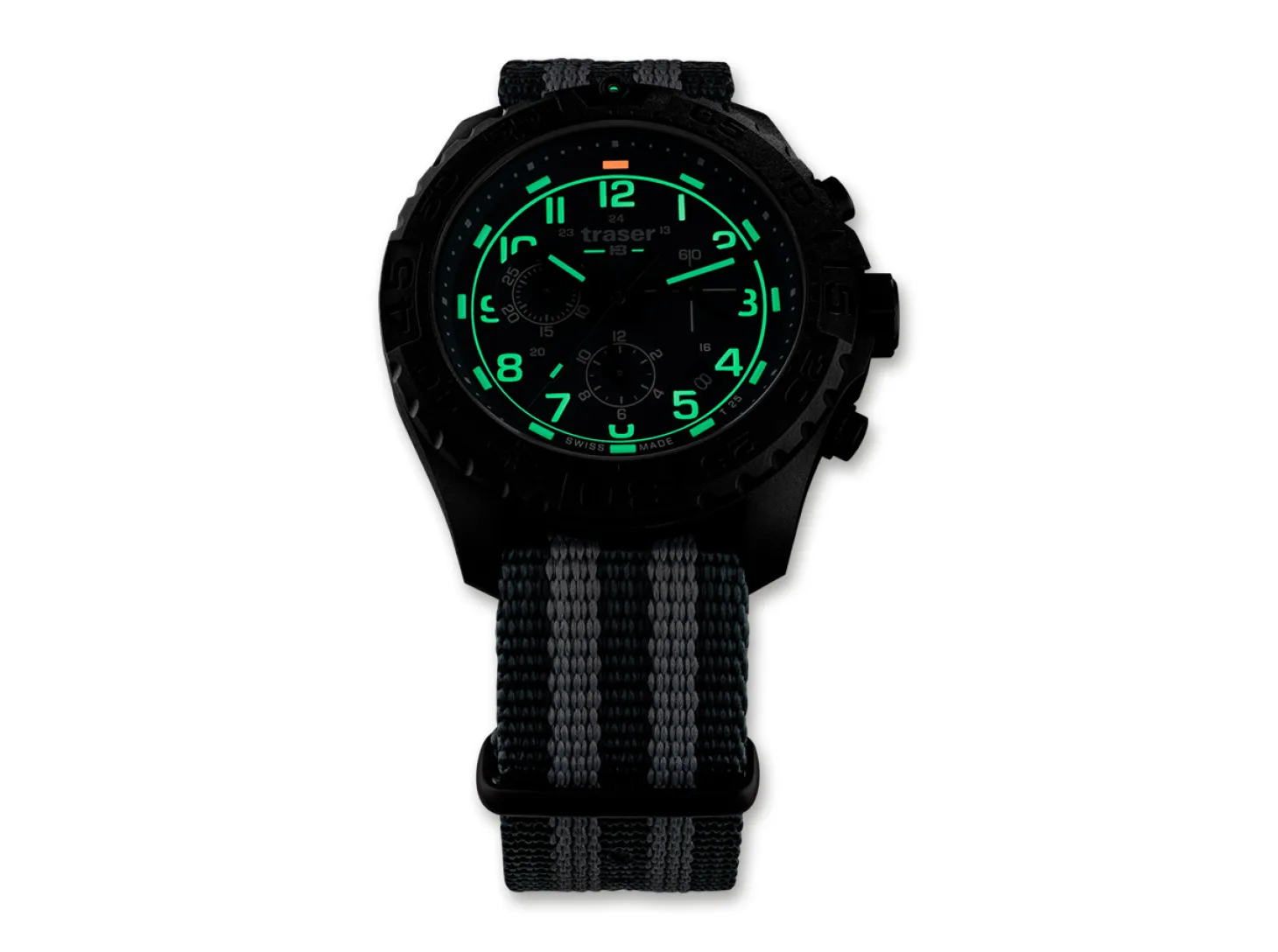 Die Traser P96 OdP Evolution ist der ideale Zeitmesser für Entdecker und Outdoor-Enthusiasten, der bei keinem Abenteuer fehlen darf. Extrem leicht, zäh und robust – diese Eigenschaften charakterisieren die sportliche P96 Outdoor Pioneer am besten. Zusätzliche Robustheit verleiht der P96 ein widerstandsfähiges glasfaserverstärktes Polymer-Gehäuse. Die Ablesbarkeit bei Nacht ist durch die hauseigene Selbstleuchttechnologie trigalight jederzeit gewährleistet.Die Uhr hat einen Durchmesser von 44 Millimetern und ist mit anti-reflektierendem, kratzfestem Saphirglas und einem Original Swiss Made Quarz Chrono Uhrwerk ausgestattet. Die grünen Ziffern und Uhrzeiger sitzen auf einem grauen Ziffernblatt. Das mehrfarbige Nato-Armband ist angenehm zu tragen. Die Uhr verfügt über eine Stoppfunktion und ist wasserdicht bis 20 bar oder 200 Meter. Die trigalight Selbstleuchttechnologie erleuchtet Index 1 bis 11 in grüner Farbe und Index 12 in orangener Farbe. Zusätzlich ist die einseitig drehbare Lünette mit Super-LumiNova beschichtet.