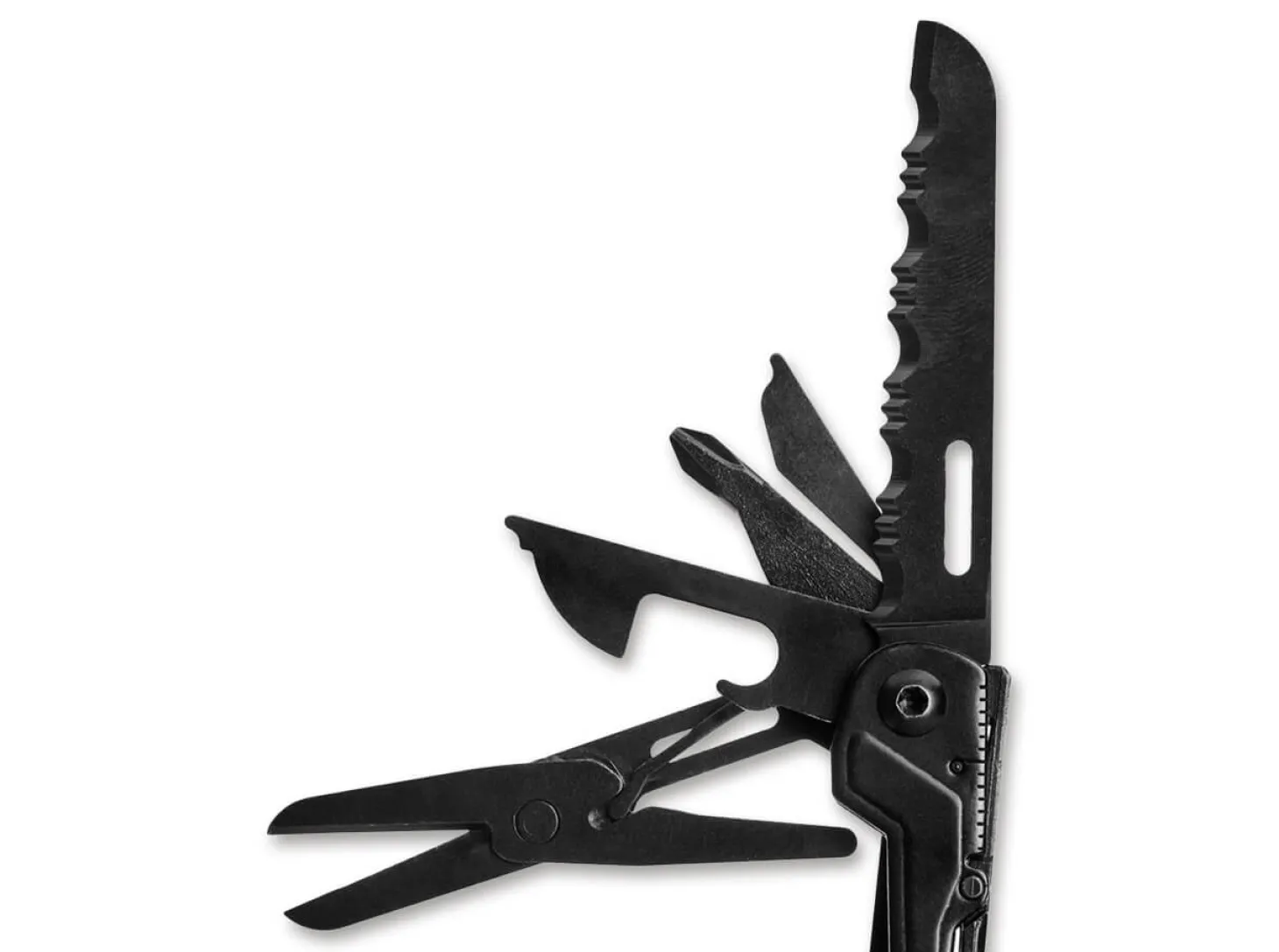 Das taktisch schwarze SOG PowerPint ist ein vollwertig ausgestattetes Multitool mit 18 Funktionen, das angesichts seiner umfangreichen Funktionen und der überaus belastbaren Konstruktion mit einem Gewicht von schlanken 119 Gramm überrascht. Der Zangenkopf mit der bewährten kraftsteigernden Zahnkranzübersetzung enthält vorn die flache Greiffläche als Spitzzange, dann das sogenannte Brennerloch zum Greifen von Außensechskantschrauben, Rohren und Überwurfmuttern, sowie die Schneidfläche mit Hart- und Weichdrahtschneider. Weitere Funktionen sind: Sheepfoot-Messerklinge mit Wellenschliff, Schere; Gurt- und Leinenschneider, Phillips-Schraubendreher # 1, Stech- und Bohrahle, Feinmechaniker-Schraubendreher, kleiner Schlitzschraubendreher, Dreiseitenfeile, Hex-Bit-Halter (1/4“), Lineal in Inch und Zentimeter, Dosen- und Flaschenöffner.