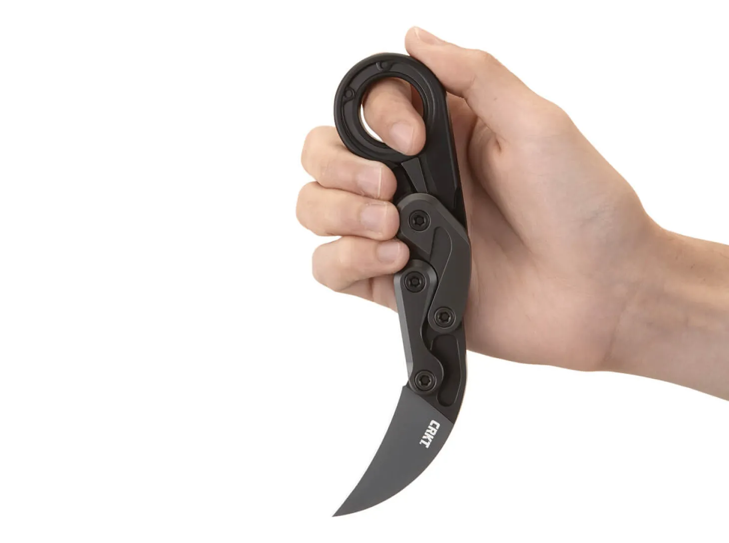 Eine ganz neue Dimension von Taschenmessern stellt die CRKT Messerserie Provoke von Joe Caswell dar. Der dabei verwendete Kinematic Mechanismus ist mit keinem anderen Taschenmesser vergleichbar. Die auf zwei beweglichen Armen gelagerte Hawkbill-Klinge dreht sich nicht klassisch um eine Achse, sondern wird vom Griff parallel nach vorne herausgeschwenkt und verriegelt. Die Verriegelung des Kerambits wird mit dem in Griff eingelassenen Hebel wieder gelöst. Die Bedienung ist so unkompliziert und intuitiv, dass stets ein sicheres und schnelles Handling gewährleistet ist.Die Griffelemente werden aus 6061 T6-Aluminium gefertigt, während die titannitridbeschichtete Klinge aus D2 besteht und beeindruckende 5,3 Millimeter stark ist. Der runde Clip trägt im Gebrauch des Messers nicht auf, lässt sich jedoch mit leichtem Fingerdruck aus seiner Parkposition holen, um das Messer wegzustecken. Das einzigartige Konzept des Provoke beweist anschaulich, dass auch im Bereich der Klappmesser noch grundlegende Innovationen möglich sind. Das Provoke First Responder ist zusätzlich mit einem Glasbrecher und einer Scheide aus Boltaron ausgestattet, einem hitzebehandelten Kunststoff aus den USA. Lieferung mit Kydexscheide und zwei unterschiedlichen Befestigungsclips bzw. Gürteladaptern, für eine Vielzahl unterschiedlicher Trageoptionen.