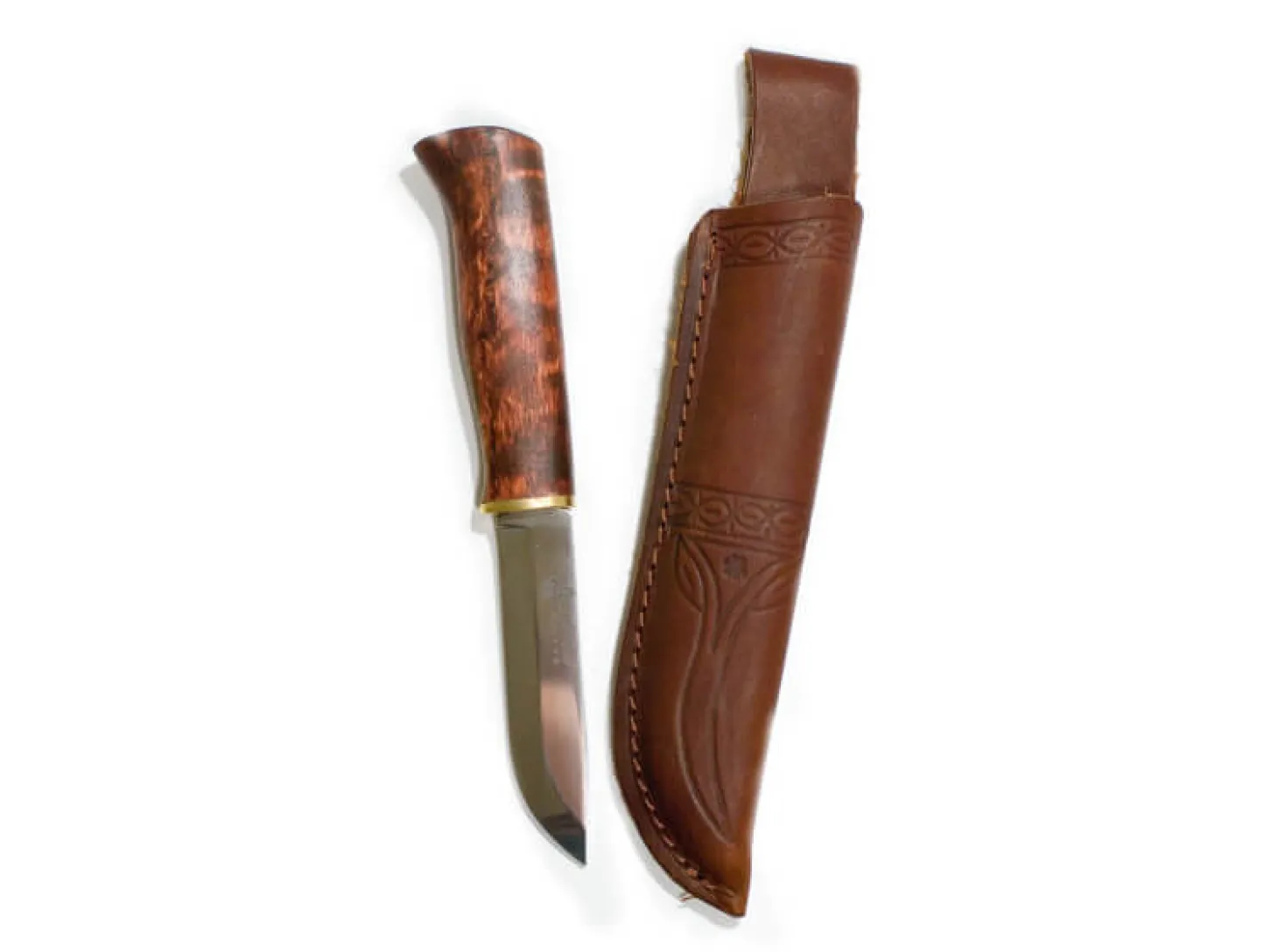 Messergriff aus geölter Maserbirke, Klinge 21 x 100 mm aus rostfreiem Sandvik-Stahl 12C27, gehärtet auf 57HRC. Messerscheide aus Rindleder mit Kunststoffeinlage.
