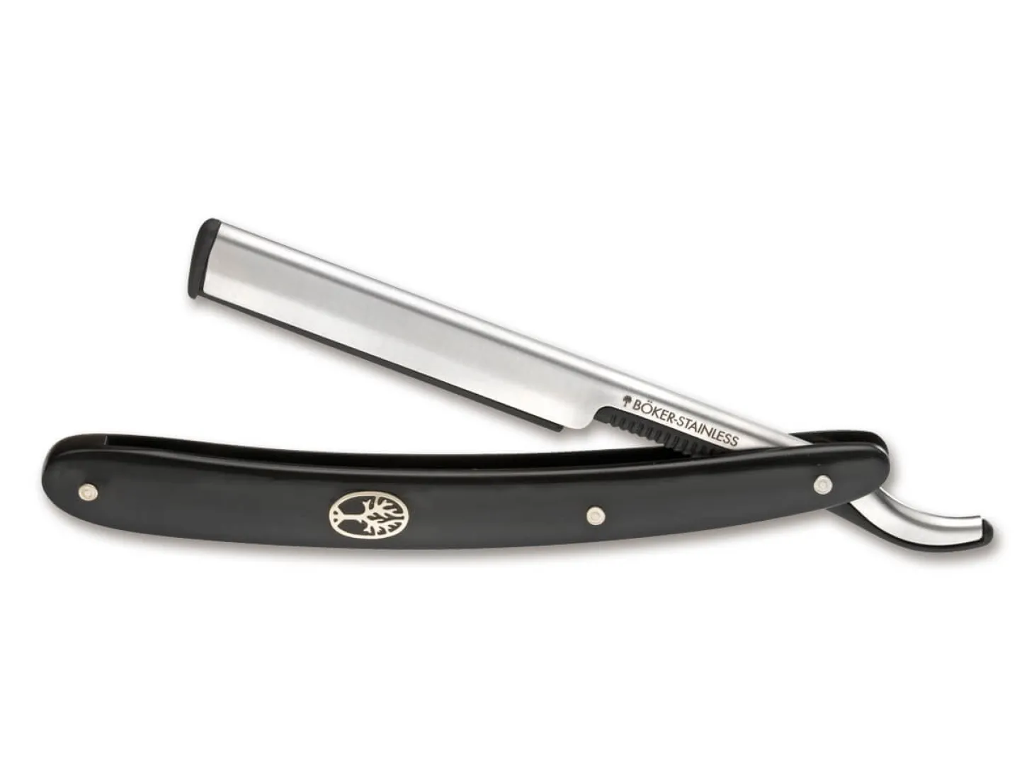Die Böker Razette vereint stilvoll die Vorteile eines geschmiedeten Rasiermessers mit denen eines Rasierhobels. Das Handling ist vergleichbar mit einem Rasiermesser, jedoch entfällt der Aufwand des Reinigens und Lederns, da die austauschbaren Rasierklingen einfach gewechselt werden können. Das vollständig neu konzipierte Böker Rasierklingenmesser erfreut sich nicht nur bei Nassrasuranfängern, auf Reisen und bei gewerblich arbeitenden Barbieren und Frisören höchster Beliebtheit, sondern findet auch im heimischen Badezimmer als pflegeleichter und komfortabler Begleiter vielfach Anwendung. Gerade Barbiere nutzen im dicht getakteten Geschäftsbetrieb aufgrund der Hygienevorschriften gerne die unkomplizierten Wechselklingen, anstatt traditionelle Rasiermesser zu desinfizieren. Das Böker Rasierklingenmesser folgt in Geometrie und Größe exakt unseren geschmiedeten Rasiermessern. Dank der gerillten Kunststoffauflagefläche bietet es den Fingern jederzeit sicheren Halt. Die Klingenaufnahme besteht aus rostfreiem Edelstahl und feuchtigkeitsresistentem Kunststoff und ist so konzipiert, dass sowohl die überall erhältlichen 43 mm Standardklingen für klassische Rasierhobel (Double Edge), als auch 65 mm lange Standardklingen verwendet werden können. Vor dem Einsetzen werden die Doppelrasierklingen vorsichtig in der Mitte durchgebrochen.Die Hefte der Rasierklingenmesser orientieren sich an den geschmiedeten Rasiermessern aus der Böker Manufaktur und lassen keine Wünsche offen. Feuchtigkeitsresistenter Kunststoff mit Neusilber-Intarsie, handverlesenes Olivenholz mit kontrastreicher Maserung und aufwendiger Verzierung oder echtes Horn mit Zierniete stehen zu Auswahl. Die Böker Barberette verbindet professionelle Praxistauglichkeit mit der gewohnten Handhabung und Balance sowie der authentischen Ästhetik eines klassischen Rasiermessers. Zudem bietet es für den Anfänger eine preisliche Alternative zum geschmiedeten Rasiermesser. Auslieferung erfolgt in historischer Verpackung mit einer Double Edge-Klinge.Dieses Modell besticht neben dem unschlagbaren Preis-Leistungsverhältnis durch seine edle Anmutung. Die stilvolle Böker-Baum-Intarsie aus Neusilber wird in aufwendiger Handarbeit in das Heft aus Kunststoff eingesetzt. Die Klingenaufnahme aus rostfreiem Stahl mit Kunststoffeinschub ist geeignet für handelsübliche Standardklingen mit 43 mm und 65 mm Breite.