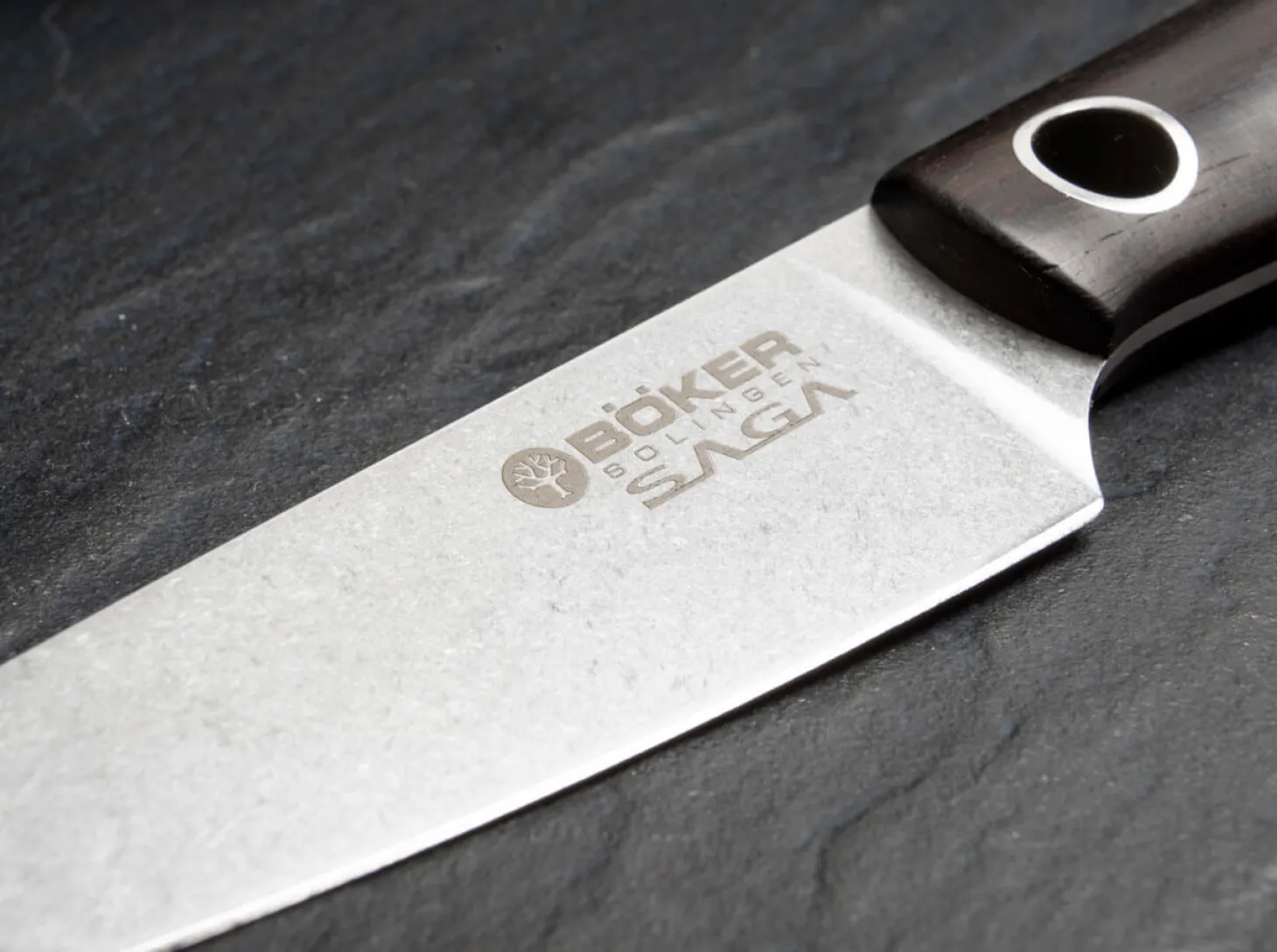 Das Spickmesser, oder auch Allzweckmesser, ist eine sehr handliche Mischung aus Kochmesser und Schälmesser. Häufigster Einsatzbereich des Allzweckmessers in der Küche ist das Verarbeiten von Obst und Gemüse, das damit sowohl geschält als auch geschnitten werden kann. Aber auch kleinere Fisch- und Fleischstücke lassen sich damit bequem schneiden. Da das beidseitig geschliffene Messer sehr häufig gebraucht wird, sollte es in keiner Küche fehlen.Mit unserer Küchenmesserserie Böker Saga, von Hand hergestellt in unserer Manufaktur in Solingen, vollziehen wir einen Brückenschlag und heben das Thema „Schneiden in der Küche“ auf ein neues Niveau.Unsere jahrzehntelangen Erfahrungen im Bereich Outdoormesser sowie der Ideenreichtum und die Kreativität des dänischen Messermachers Jesper Voxnæs sind in das Konzept und das Design von Saga eingeflossen, um ergonomisch und schneidtechnisch neue Maßstäbe zu setzen. Der sorgfältige Transfer dieses gemeinsamen Know-Hows in den kulinarischen Bereich bürgt dafür, dass das Arbeiten mit Böker Saga zu einem einzigartigen Erlebnis wird.Die sanft geschwungenen Griffe werden aus exklusiv zertifiziert importiertem Grenadillholz gefertigt. Mit seiner hohen Härte und Dichte ist Grenadill u.a. fest etabliert im europäischen Holzblasinstrumentenbau. Schon bei der ersten Kontaktaufnahme mit der Messerserie Böker Saga wird die gelungene Ergonomie deutlich: Jeder Bogen, jeder Schwung in der Linie schmiegt sich an seine Stelle in der Hand und vermittelt eine absolute Kontrolle und ein überragendes Schneiderlebnis. Das schwalbenschwanzartig verbreiterte Griffende der größeren Modelle bringt zusätzliche Griffsicherheit. Die hohe Stabilität verdankt Böker Saga dem komplett durchgehenden Erl, der das Messer (in der gleichen Bauweise wie viele Jagdmesser) von der Klingenspitze bis zum Griffende durchzieht. Für eine optimale Schneidleistung steht nicht nur der komplette Flachschliff der Klinge mit Stonewash-Finish, sondern auch die Wahl von 440C als Klingenstahl, der hinsichtlich Schnitthaltigkeit und Korrosionsbeständigkeit übliche Küchenmesserstähle weit übertrifft. Dieses in einem speziellen Schleifverfahren erzeugte Oberflächenfinish zeichnet sich durch hervorragende Gleiteigenschaften im Schnittgut aus und fördert so die ohnehin ausgezeichnete Schneidleistung. Des weiteren ist die Mikrostruktur des Stonewash-Finish extrem unempfindlich gegen Kratzer, da diese sich optisch in der Struktur oft verlieren..Den besonderen Akzent setzen die großen Hohlnieten, die unverkennbar die Handschrift von Jesper Voxnæs tragen.
