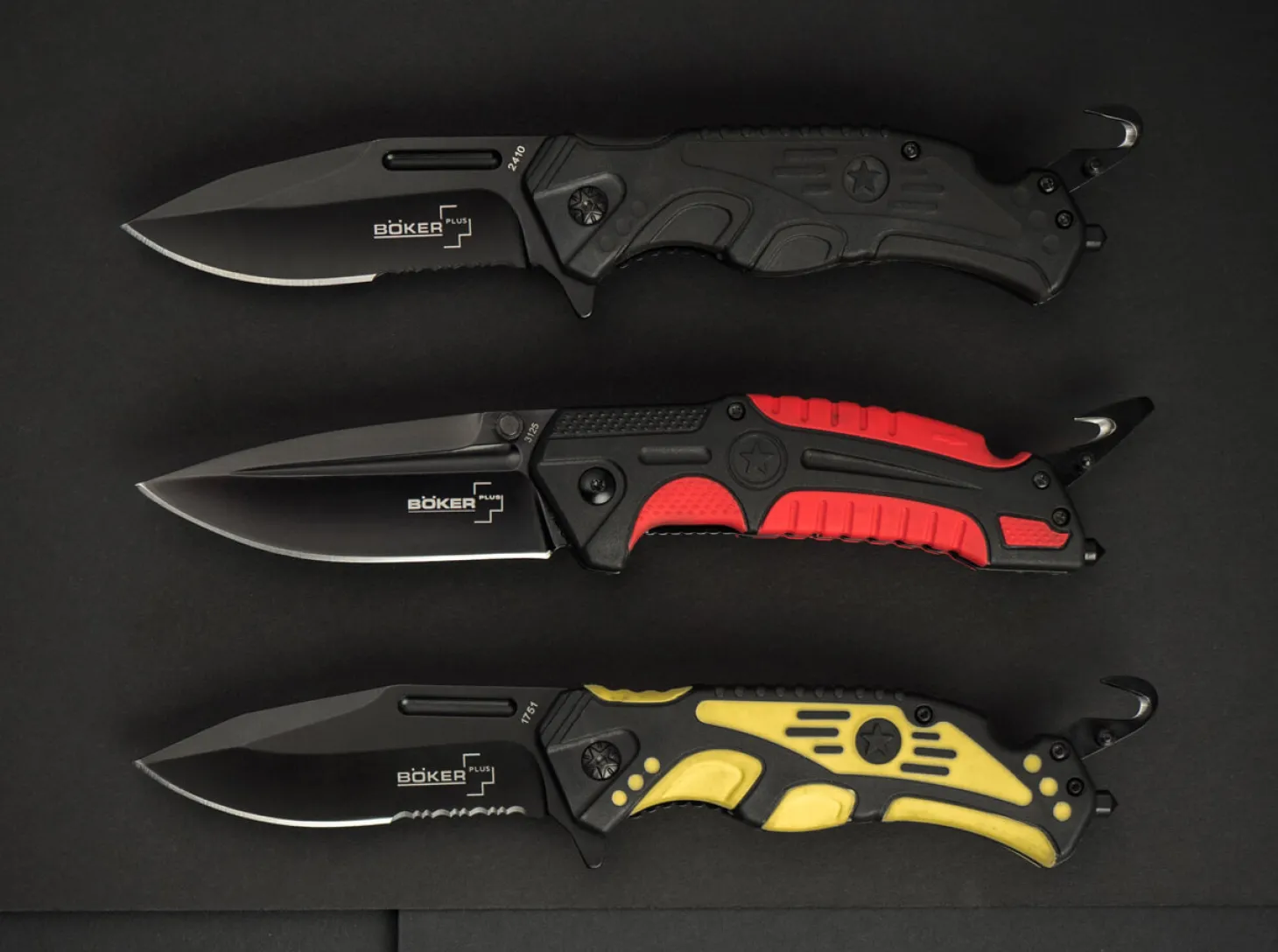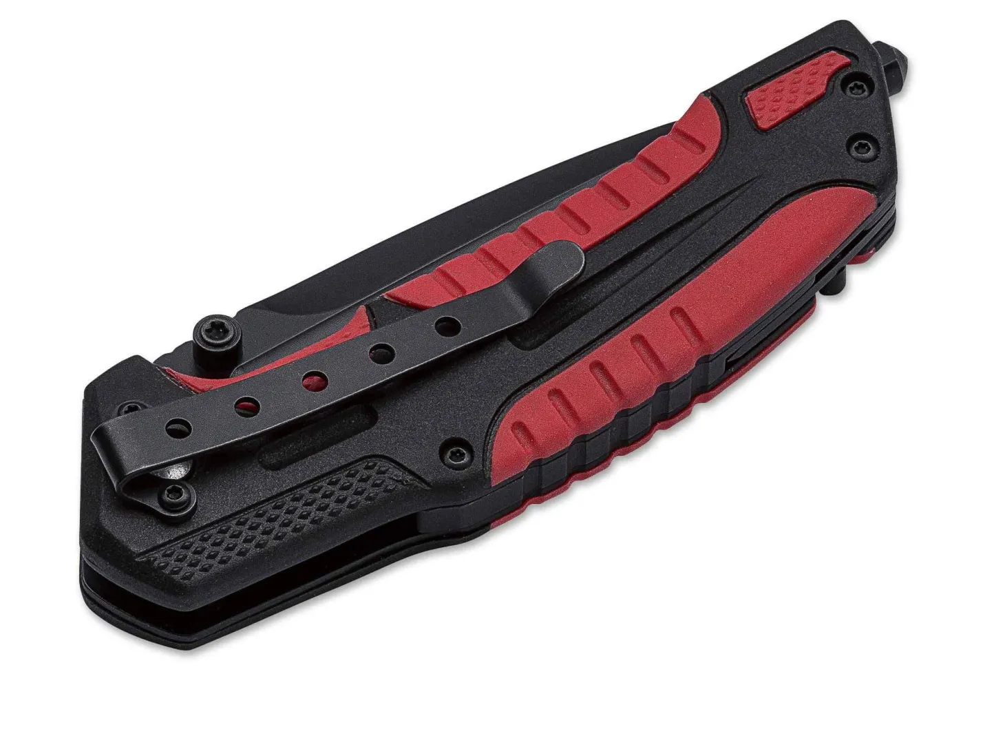 Die Rettungsmesserserie Böker Plus Savior ist sowohl für den privaten Nutzer konzipiert, der sich für den Fall eines Unfalles für die Fremd- oder Eigenhilfe wappnen möchte, wie auch für den professionellen Anwender, der das Messer dienstlich als Rettungswerkzeug führt. Solide Stahlplatinen tragen eine glasfaserverstärkte Kunststoffbeschalung, die an strategischen Stellen mit direkt aufgespritzten gripfördernden roten TPR-Gummieinlagen versehen sind. Dies gewährleistet ein sicheres Handling auch bei Nässe oder Kälte und in Stresssituationen. Der auswechselbare Glasbrecher am Griffende knackt zuverlässig jede Seitenscheibe, und der ausklappbare Gurtschneider ermöglicht das gefahrlose Kappen von Gurten auch nah am Körper. Klinge mit glatter Schneide und abnehmbaren Daumenknopf. Die Messer sind mit einem abnehmbaren Clip (Tipdown) ausgestattet. Lieferung mit hochwertigem Nylon-Gürteletui.
