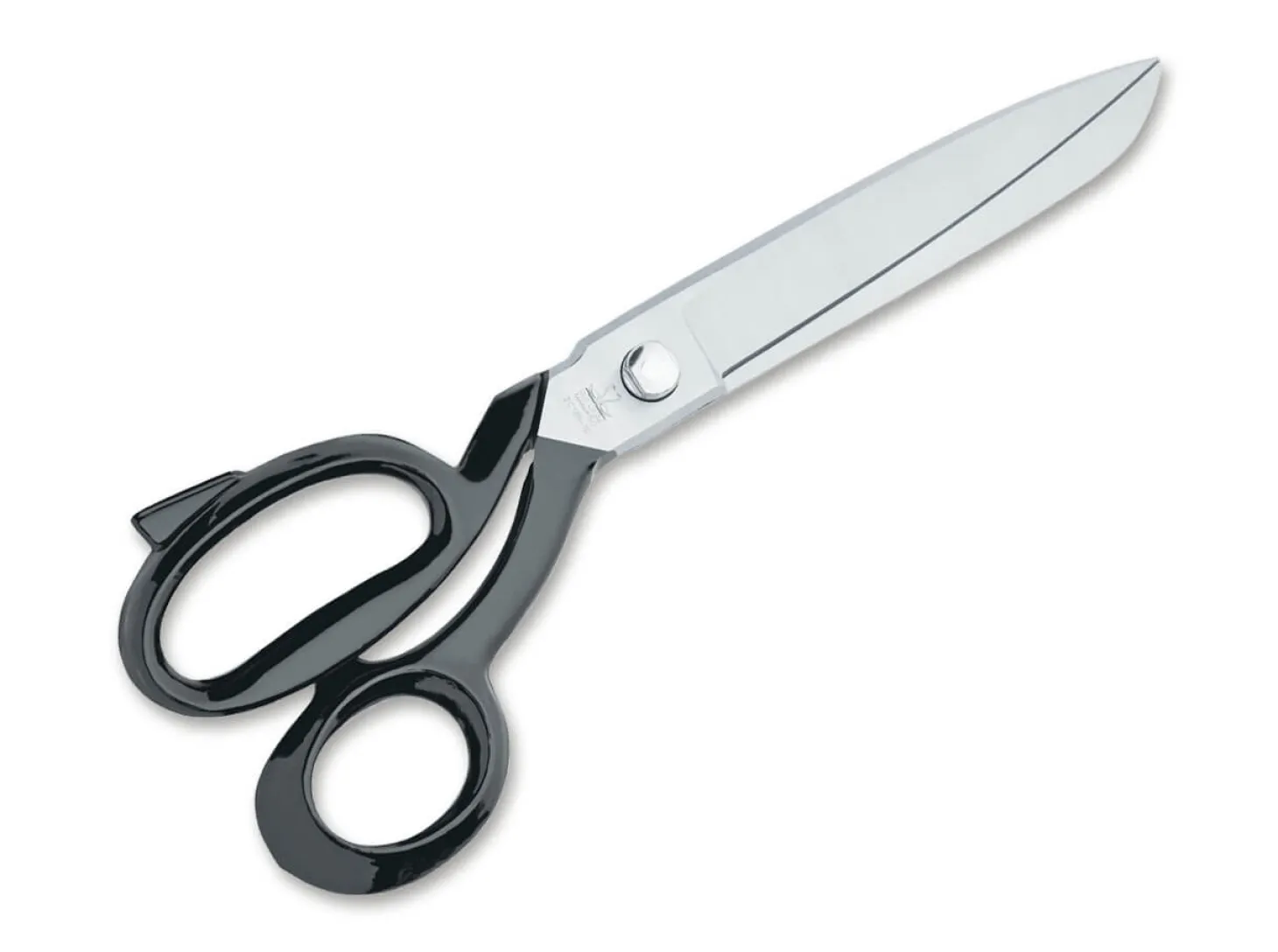 Die hochwertige Schneiderschere 185 von Due Cigni wird aus Kohlenstoffstahl gefertigt. Augen und Halme der Stoffschere sind schwarz lackiert.