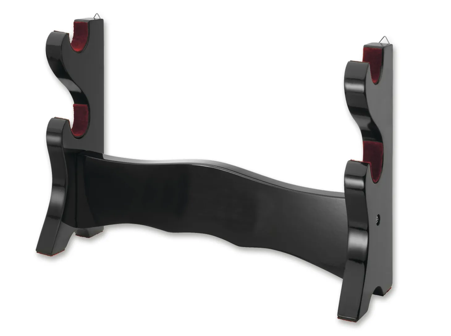 Mit diesem aus schwarz lackiertem Holz gefertigten Schwertständer können Sie ein Daisho (zwei Schwerter) adequat präsentieren. Die Schwertaufnahme ist mit rotem Filz ausgekleidet, was Kratzer am Griff oder der lackierten Saya verhindert. Ebenso sind die Standfüße mit Filz versehen. Einschließlich Wandmontagemöglichkeit. B: 28,5 cm, H: 23,5 cm.