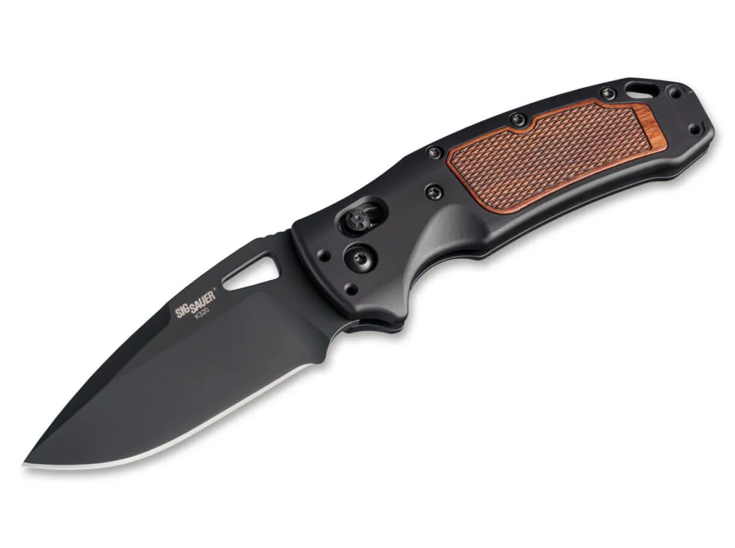 In Zusammenarbeit mit dem US-amerikanischen Messerspezialisten Hogue präsentiert SIG das K320 AXG Classic als taktisches Einsatzmesser in mit taktisch-klassischem Gewand. Die Droppoint-Klinge aus pulvermetallurgischem CPM-S-30V ist mit einer Fehlschärfe sowie einem Black Cerakote Finish versehen und wird per Daumenöffnung in Betrieb genommen. Zur Sicherung der Klinge kommt der robuste ABLE Lock zum Einsatz, der diese durch ein Zurückschieben des seitlichen Knopfes wieder löst. Herausragende Haptik bietet der ergonomische Aluminiumgriff, der mit rutschfesten Einlagen aus edlem Walnussholz versehen ist. Mit Fangriemenöse und vierfach umsetzbarem Clip.