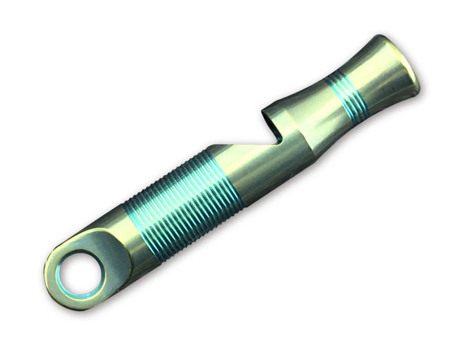 Nützliche Signalpfeife von WE Knife. Der Körper besteht aus grünem Titan.