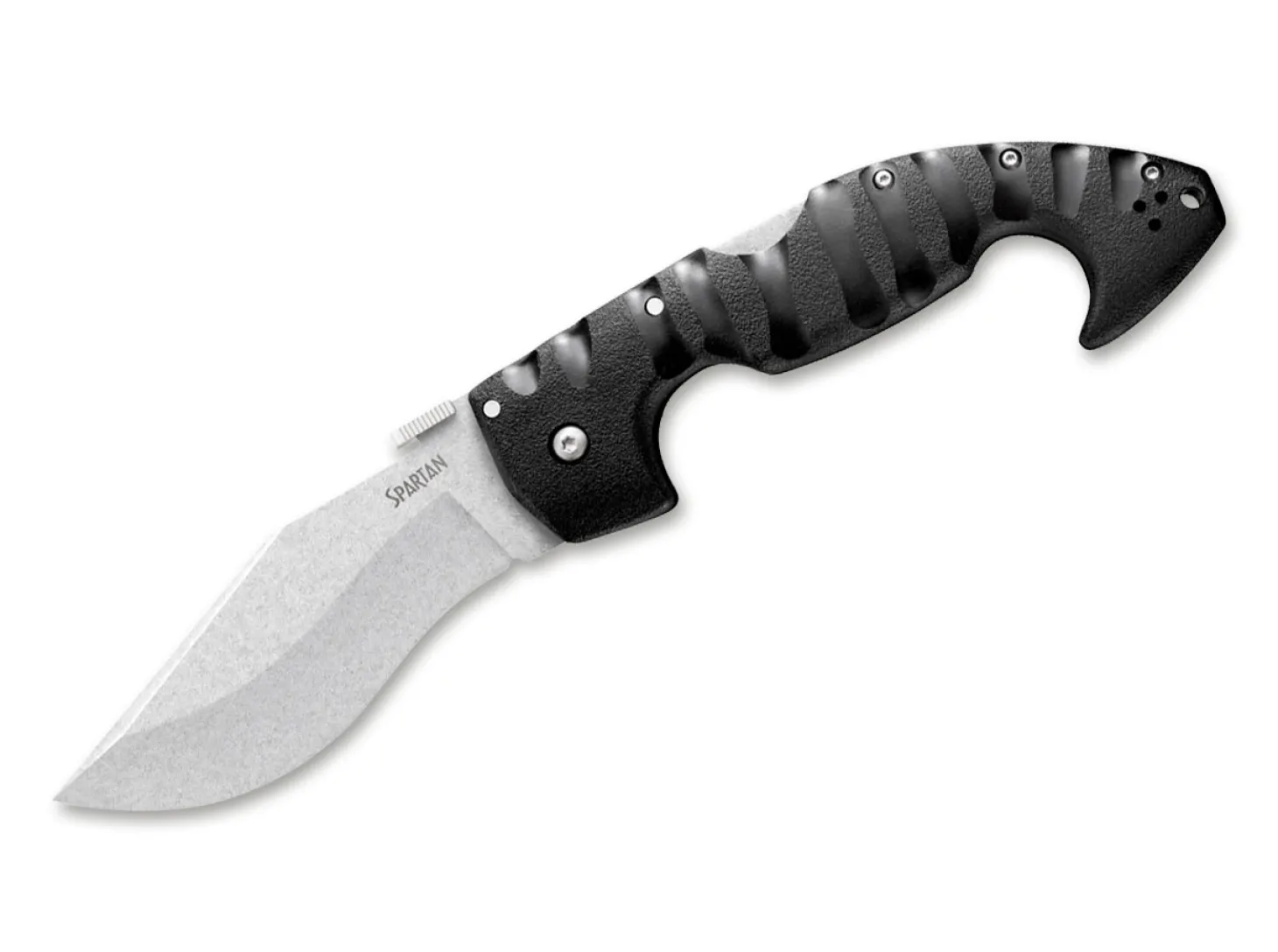 Das massive Cold Steel Spartan erinnert sowohl an die Waffen der kriegerischen Spartaner des antiken Griechenlands, als auch an ein wuchtiges Kukri aus Nepal. Es ist mit einer stabilen Stonewash-Klinge aus AUS-10A ausgestattet, die per Daumenpin geöffnet und von einem zuverlässigen Tri-Ad-Lock arretiert wird. Der schwarze Griff aus rutschfestem Griv-Ex ist mit einer Fangriemenöse und einem umsetzbarem Clip (Tip-up/l-r) versehen. Das Spartan ist daher sowohl für Links- als auch für Rechtshänder gleichermaßen gut geeignet.
