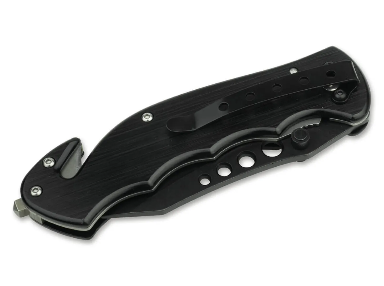 Das Magnum Special Forces ist ein funktionales Rettungsmesser, das den weltbekannten Elite-Einheiten der amerikanischen Streitkräfte gewidmet ist. Der schwarz beschichtete und leichtgewichtige Griff aus Aluminium trägt ein Emblem mit dem Wappen der Special Forces. Die rostfreie Klinge aus 440A wird per Daumenpin geöffnet und von einem stabilen Linerlock zuverlässig arretiert. Die Bohrungen verleihen der Klinge eine eigene Note und reduzieren zudem das Gewicht. Am Griffende befinden sich ein Glasbrecher und ein Gurtschneider, die das Messer für jede Notfallausrüstung prädestinieren. Mit praktischem Deep-Carry-Clip (Tip-down).Die Magnum-Rettungsmesser sind voll funktionsfähig und einsatzbereit, allerdings sind sie nicht für den täglichen, harten Einsatz von professionellen Einsatzkräften konzipiert worden. Für professionelle Anwender empfehlen wir zum Beispiel die Modelle Böker Plus Savior oder FKMD A.L.S.R. 2.