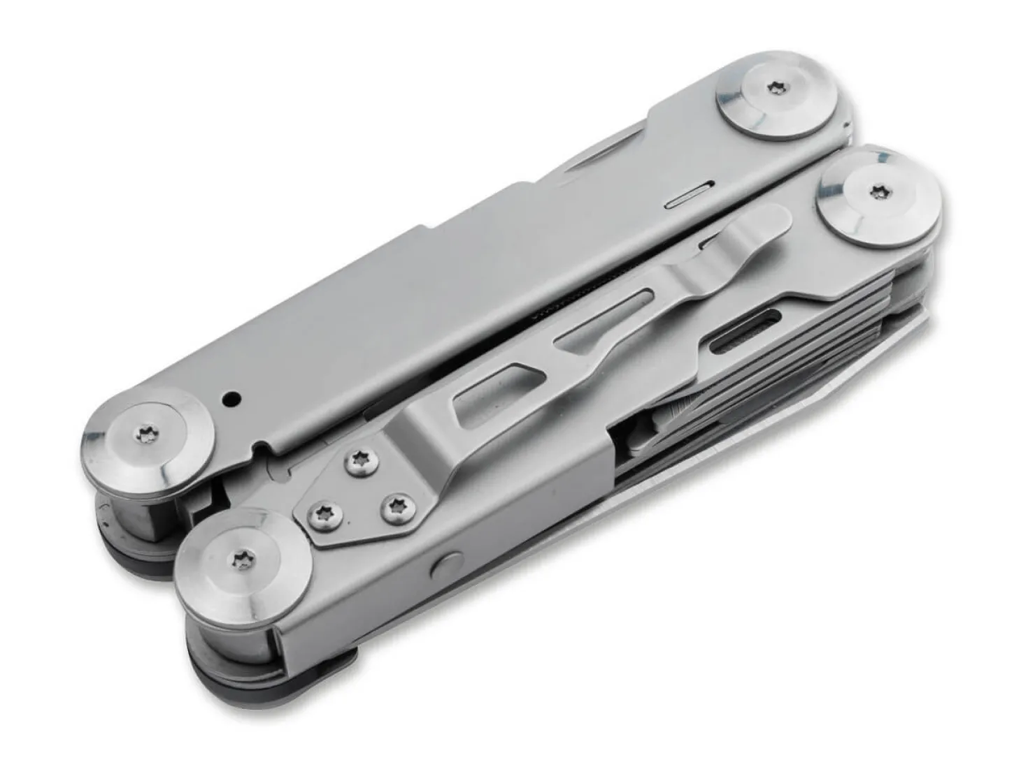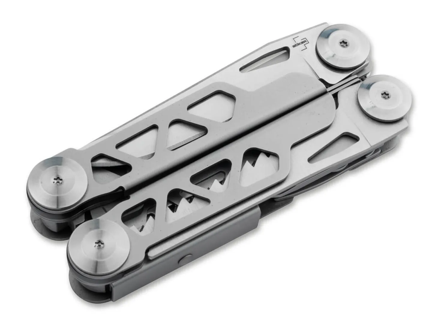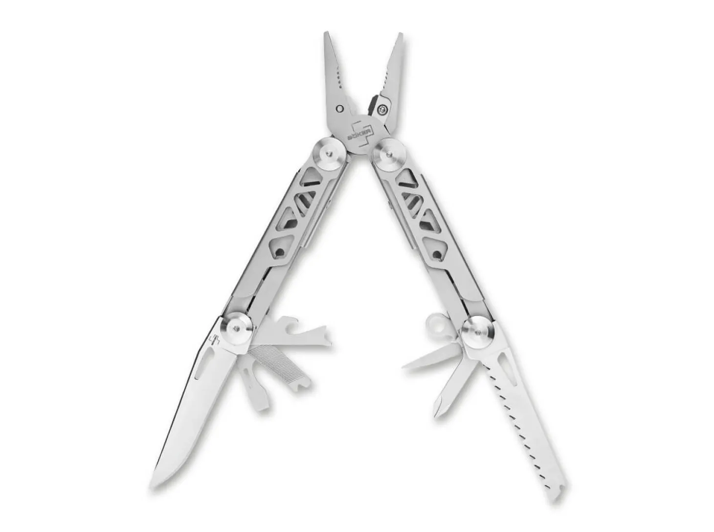 Das mit verschiedenen praktischen Werkzeugen ausgestattete Böker Plus Specialist Pro ist ein vielseitiges Multitool mit federunterstützter Zange. Sie ist mit einem verstärkten, auswechselbaren Drahtschneider versehen und hält auch hohen Belastungen stand. Neben der flachen Greiffläche ist die Zange auch mit einem sogenannten Brennerloch zum Greifen von Außensechskantschrauben, Überwurfmuttern und Rohren ausgestattet. Die in den beiden Griffhälften untergebrachten Werkzeuge lassen sich leichtgängig öffnen und können aufgrund der zuverlässigen Verriegelung besonders sicher eingesetzt werden. Zur Ausstattung des Multitools gehören neben der Kombinationszange auch eine glatte Klinge, eine Holzsäge, ein Dosenöffner, ein Flaschenöffner, ein Drahtbieger/-abisolierer, eine Näh-/Bohrahle, ein Kreuzschlitzschraubendreher, ein Schlitzschraubendreher und eine Metallfeile. Der Griffkörper aus Edelstahl ist mit dekorativen Aussparungen versehen. Mit Fangriemenöse, Clip und hochwertigem Nylon-Gürteletui.